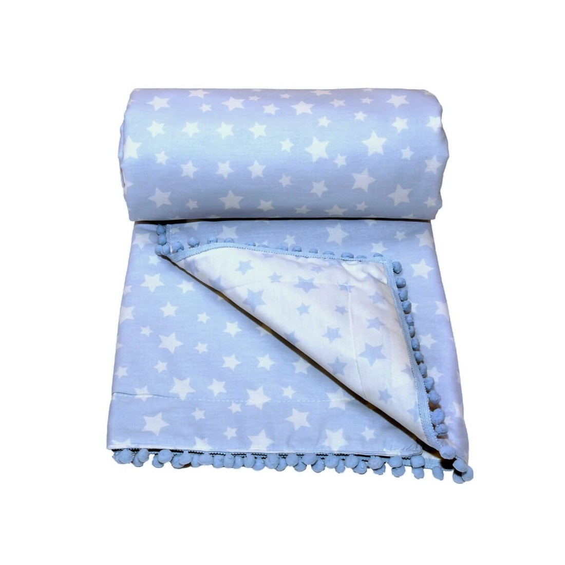 Καταπληκτικής ποιότητας αφράτο κουβερλί της Morven με πομ πον στις 3 πλευρές. Το ύφασμα είναι 100% βαμβάκι με το σχέδιο της πίσω πλευράς να είναι το αντίθετο από αυτό της εμπρός. Ενδιάμεσα έχει λεπτή βάτα ώστε να είναι κατάλληλο και για πιο δροσερές περιόδους.