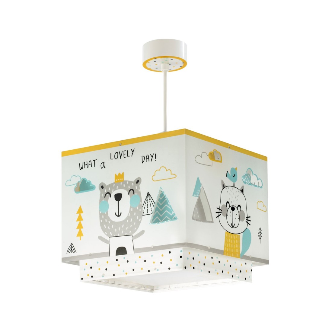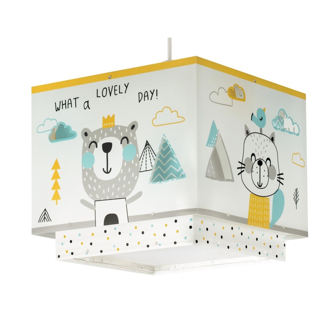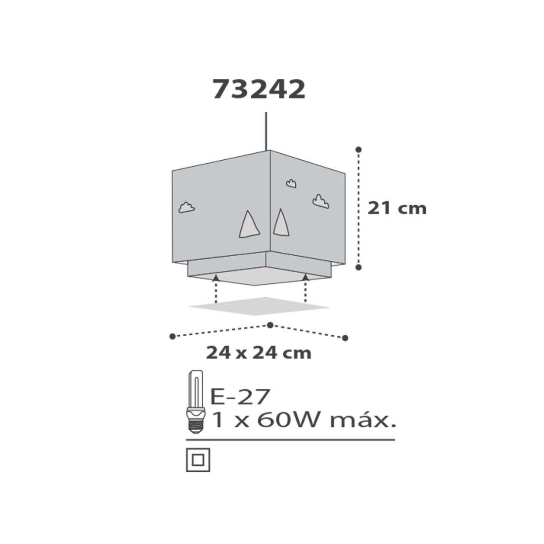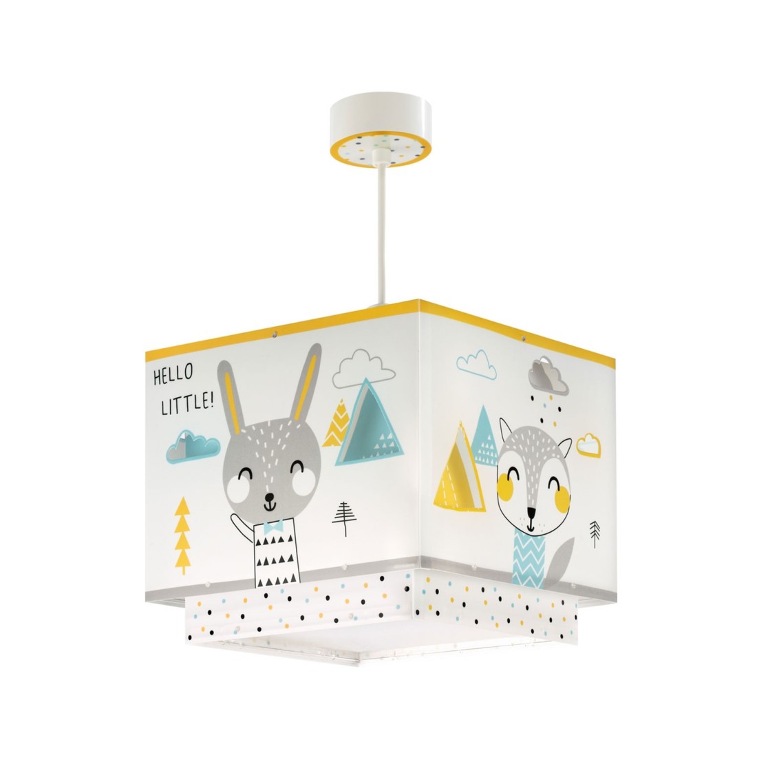 Τετράγωνης σχεδίασης βρεφικό φωτιστικό κρεμαστό οροφής κατάλληλο για γενικό φωτισμό. Διπλού τοιχώματος από συνθετικό υλικό αντοχής πολυπροπυλενίου. Κιτ ανάρτησης ρυθμιζόμενο στο ύψος με διακοσμημένη ροζέτα. Παρέχεται διαχυτής φωτός για ομοιόμορφο φωτισμό. Τύπος ντουί E27 και θέση για έναν λαμπτήρα. Κατασκευασμένο εξ ολοκλήρου στην Ευρώπη. Το Hello Little κρεμαστό φωτιστικό οροφής συμπληρώνει τα υπόλοιπα βρεφικά φωτιστικά της συλλογής.