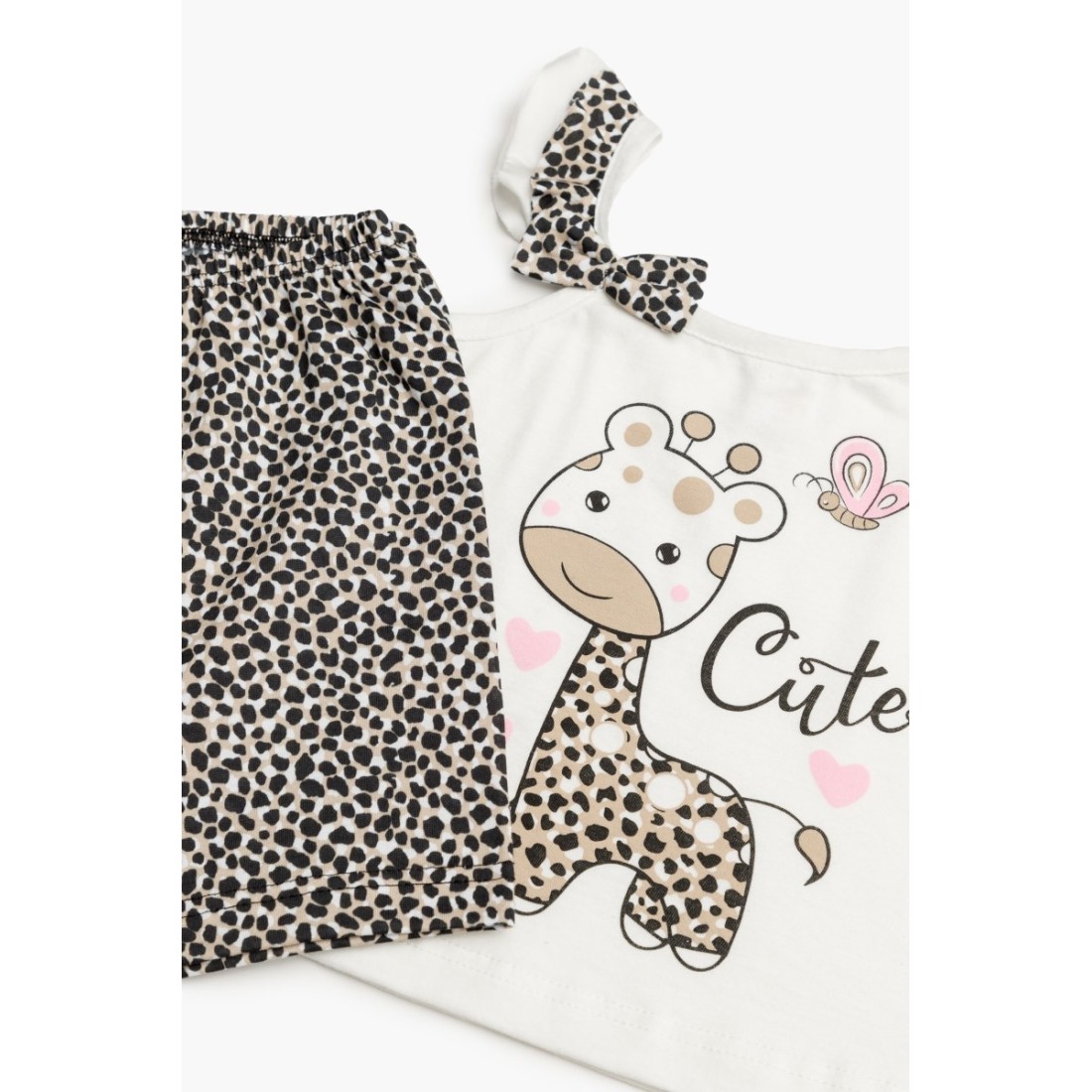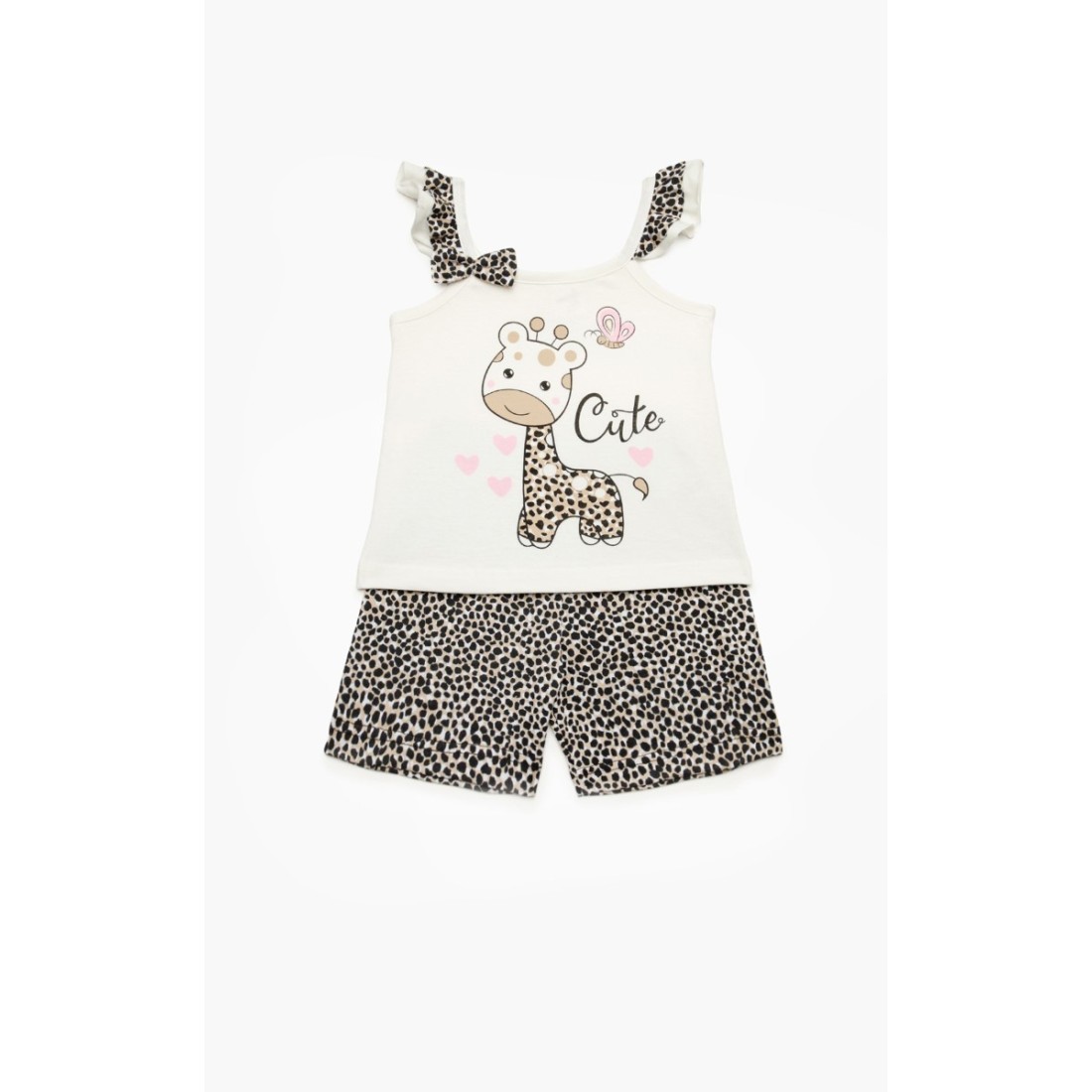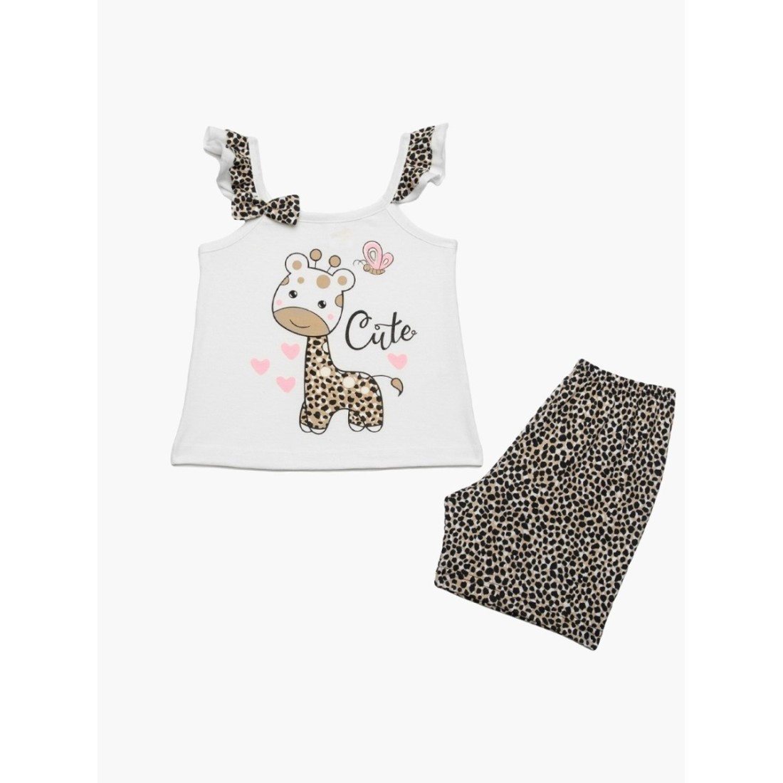 Βρεφική θερινή πιτζάμα για κορίτσι από 100% απαλό βαμβακερό ύφασμα υψηλής ποιότητας. Το σετ περιλαμβάνει αμάνικη μπλούζα με βολάν στις τιράντες, τύπωμα και εμπριμέ σορτσάκι. Συνδυάστε με τις αντίστοιχες γυναικείες πιτζάμες και δημιουργήστε το απόλυτο mother & daughter look.