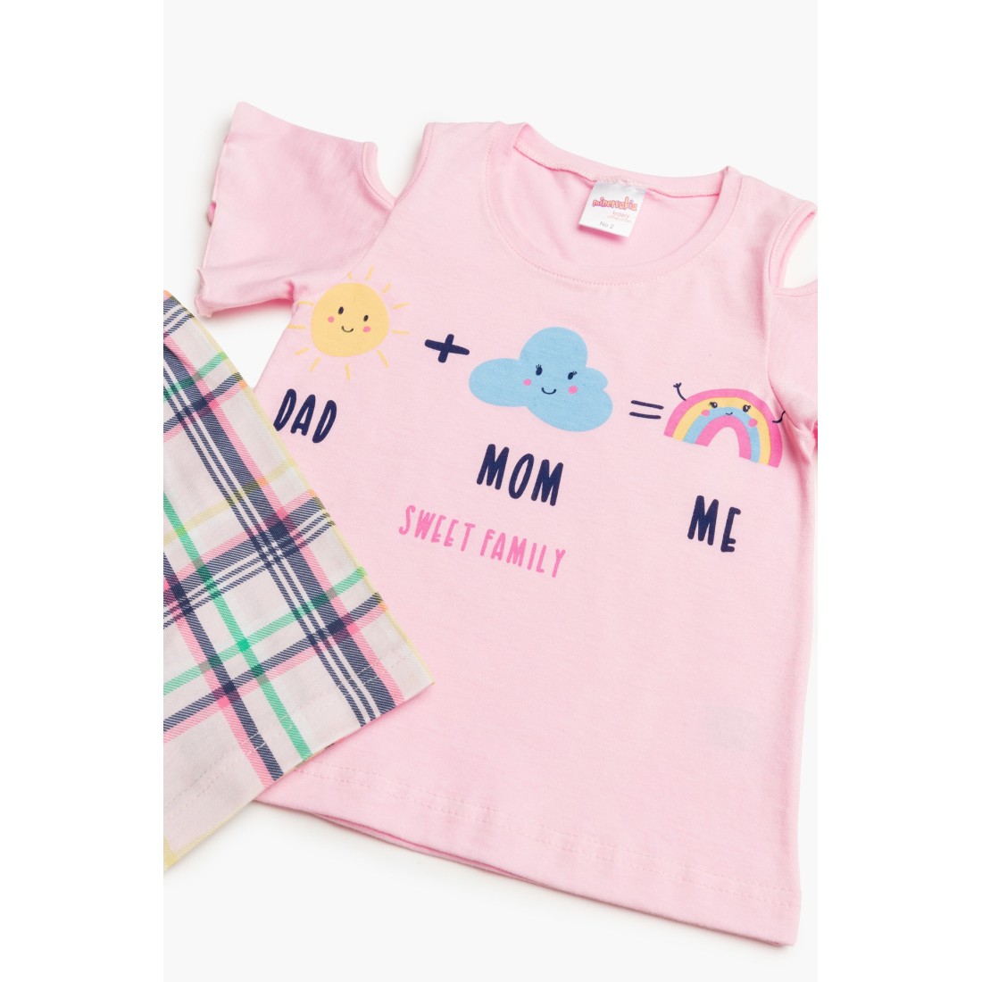 Βρεφική θερινή πιτζάμα για κορίτσι από 100% απαλό βαμβακερό ύφασμα υψηλής ποιότητας. Το σετ περιλαμβάνει μονόχρωμη κοντομάνικη μπλούζα με βολάν και ανοίγματα στα μανίκια, τύπωμα και καρό σορτσάκι. Συνδυάστε με τις αντίστοιχες γυναικείες πιτζάμες και δημιουργήστε το απόλυτο mother & daughter look.