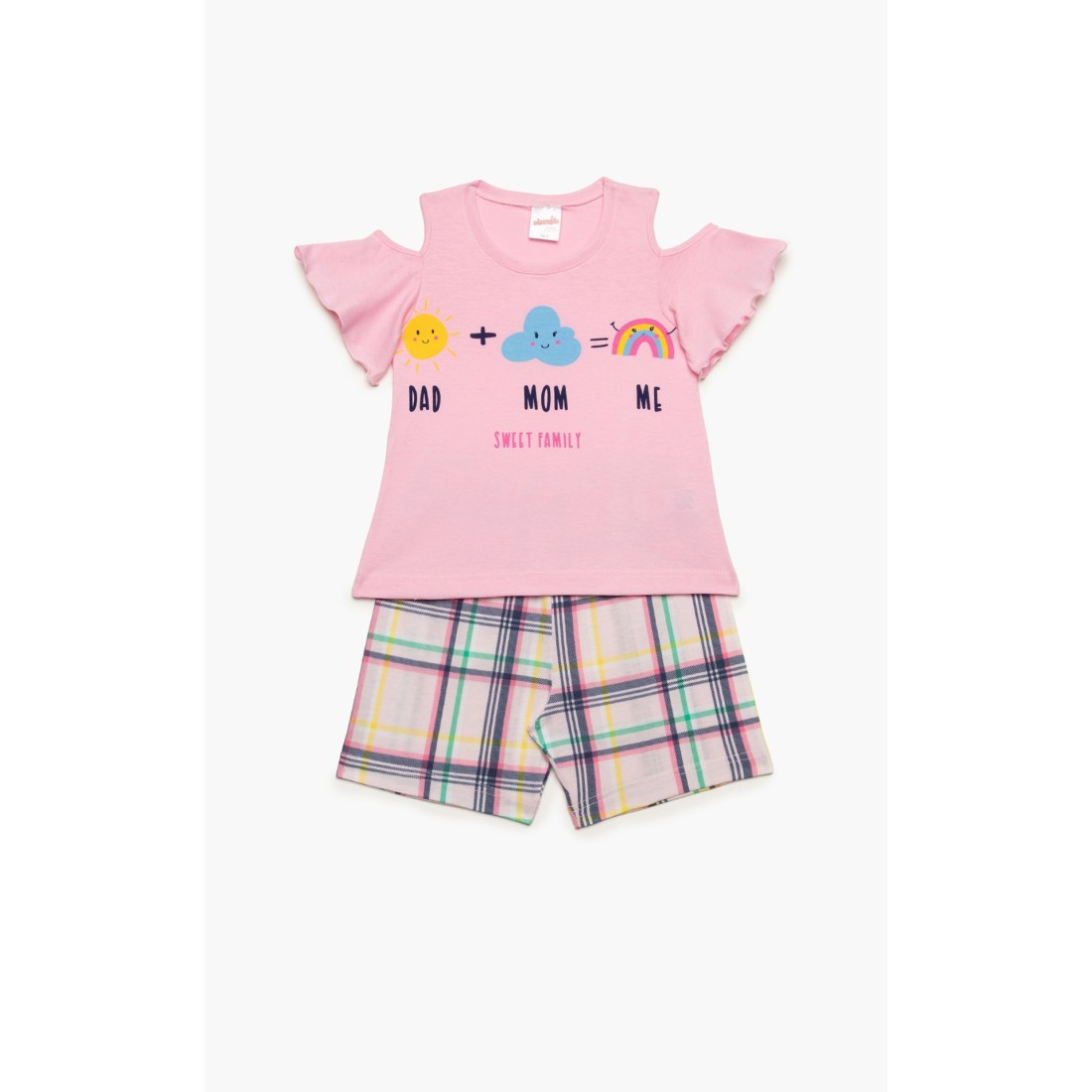 Βρεφική θερινή πιτζάμα για κορίτσι από 100% απαλό βαμβακερό ύφασμα υψηλής ποιότητας. Το σετ περιλαμβάνει μονόχρωμη κοντομάνικη μπλούζα με βολάν και ανοίγματα στα μανίκια, τύπωμα και καρό σορτσάκι. Συνδυάστε με τις αντίστοιχες γυναικείες πιτζάμες και δημιουργήστε το απόλυτο mother & daughter look.