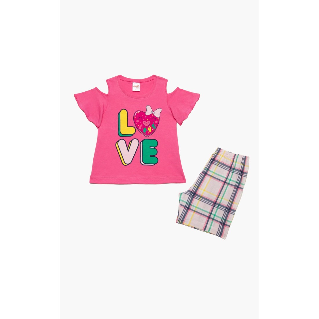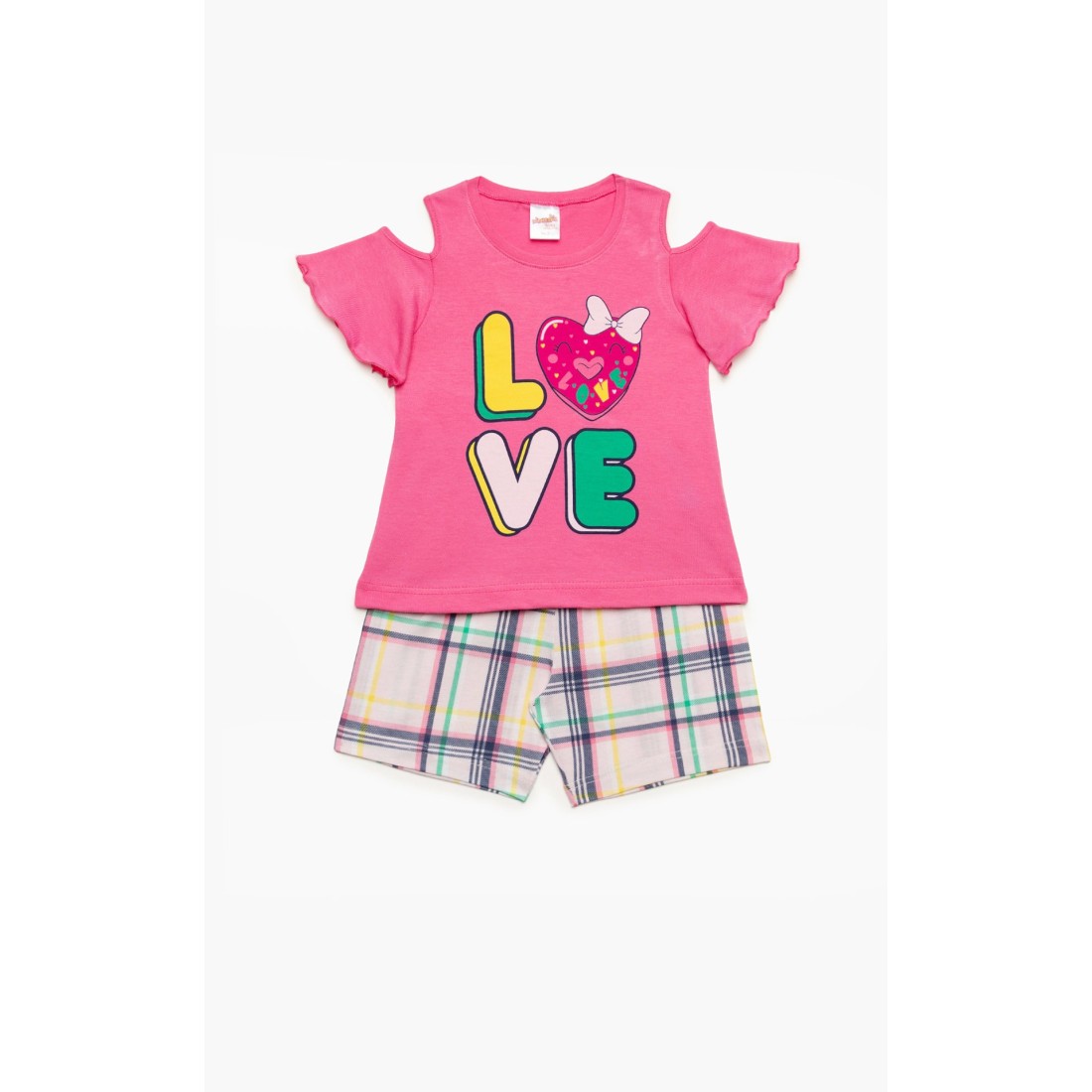 Βρεφική θερινή πιτζάμα για κορίτσι από 100% απαλό βαμβακερό ύφασμα υψηλής ποιότητας. Το σετ περιλαμβάνει μονόχρωμη κοντομάνικη μπλούζα με βολάν και ανοίγματα στα μανίκια, τύπωμα και καρό σορτσάκι. Συνδυάστε με τις αντίστοιχες γυναικείες πιτζάμες και δημιουργήστε το απόλυτο mother & daughter look.