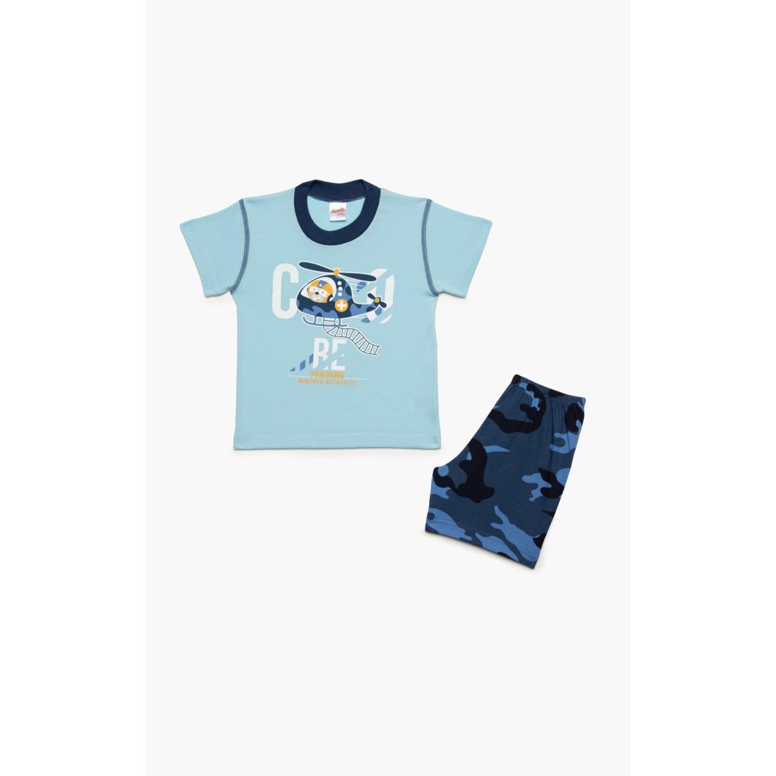 Βρεφική θερινή πιτζάμα για αγόρι από 100% απαλό βαμβακερό ύφασμα υψηλής ποιότητας. Το σετ περιλαμβάνει μονόχρωμη κοντομάνικη μπλούζα με τύπωμα και εμπριμέ military σορτσάκι με ελαστική μέση. Συνδυάστε με τις αντίστοιχες ανδρικές πιτζάμες και δημιουργήστε το απόλυτο father & son look.