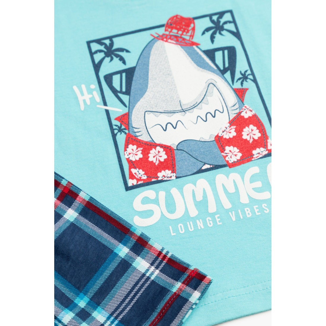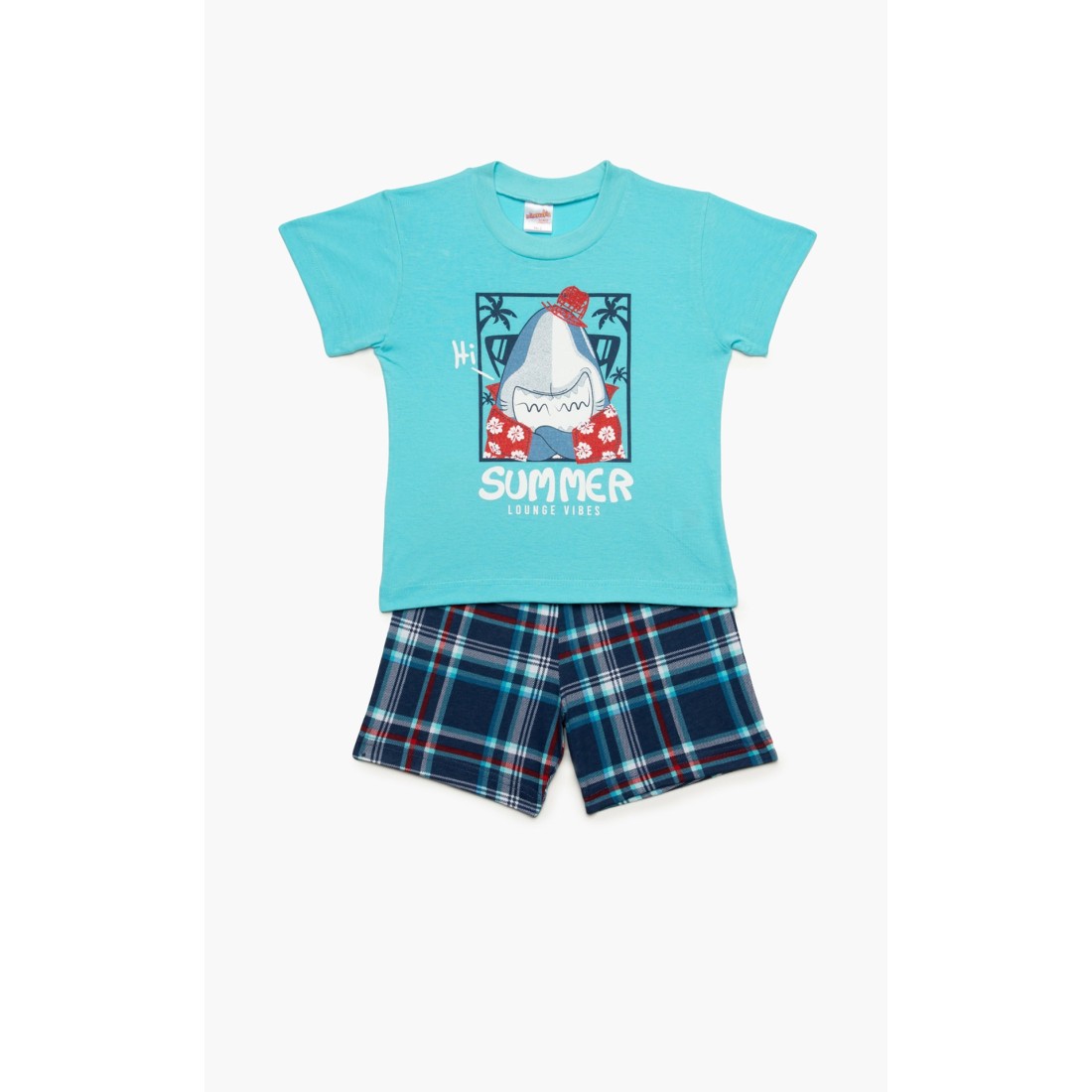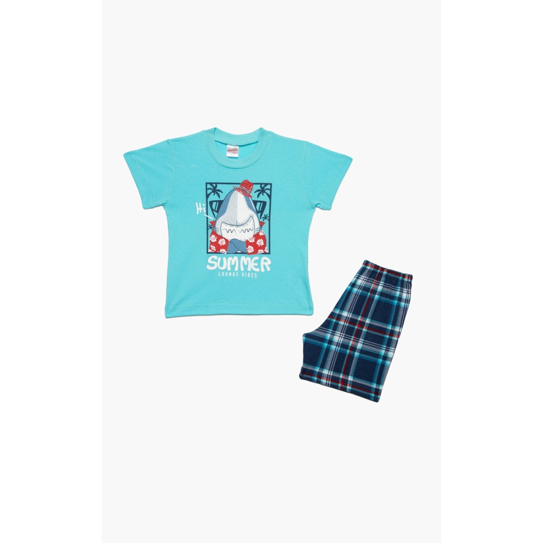 Βρεφική θερινή πιτζάμα για αγόρι από 100% απαλό βαμβακερό ύφασμα υψηλής ποιότητας. Το σετ περιλαμβάνει μονόχρωμη κοντομάνικη μπλούζα με τύπωμα και καρό σορτσάκι με ελαστική μέση. Συνδυάστε με τις αντίστοιχες ανδρικές πιτζάμες και δημιουργήστε το απόλυτο father & son look.