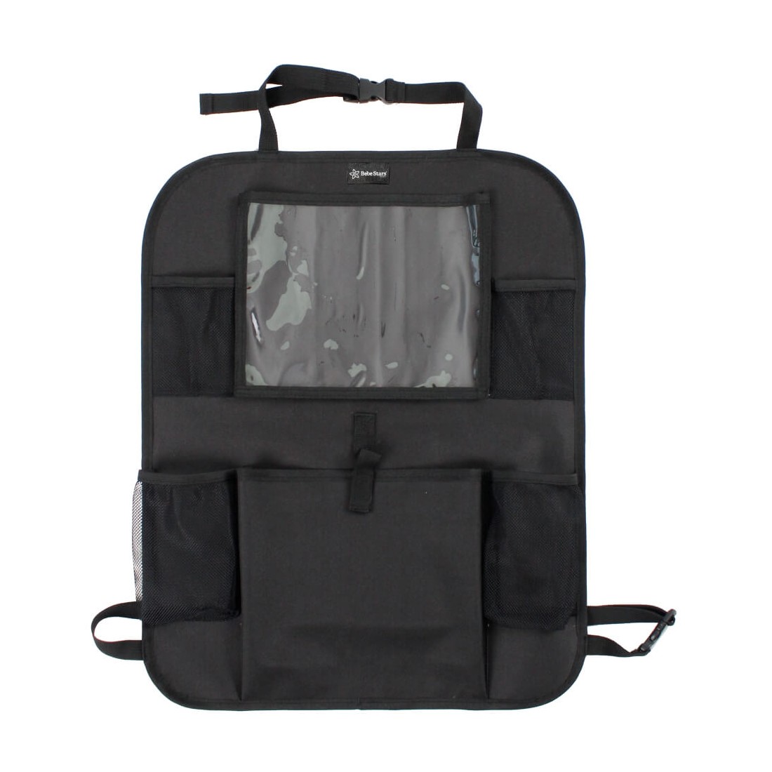Οργανωτής πλάτης καθίσματος αυτοκινήτου. Προστατεύει τα καθίσματα από βρωμιές και γρατζουνιές. Διαθέτει πολλές θήκες για αποθήκευση αντικειμένων και μία διάφανη θήκη για τοποθέτηση iPad. Εύκολη τοποθέτηση με κλιπς ιμάντα. Ταιριάζει σε όλα τα καθίσματα αυτοκινήτου.