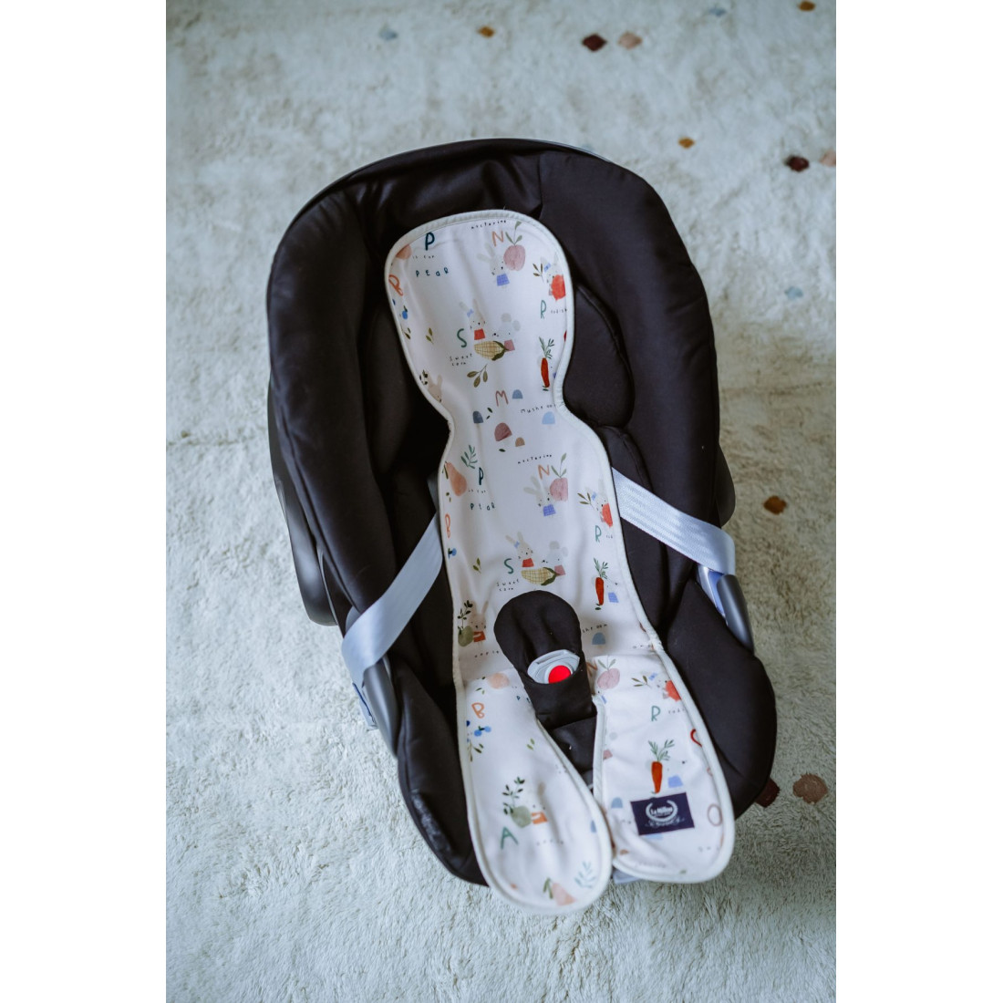 Επιπλέον, το κάτω μέρος του ένθετου έχει ένα ειδικό κούμπωμα velcro έτσι ώστε το τμήμα που προορίζεται για τα πόδια του παιδιού να μην κινείται..