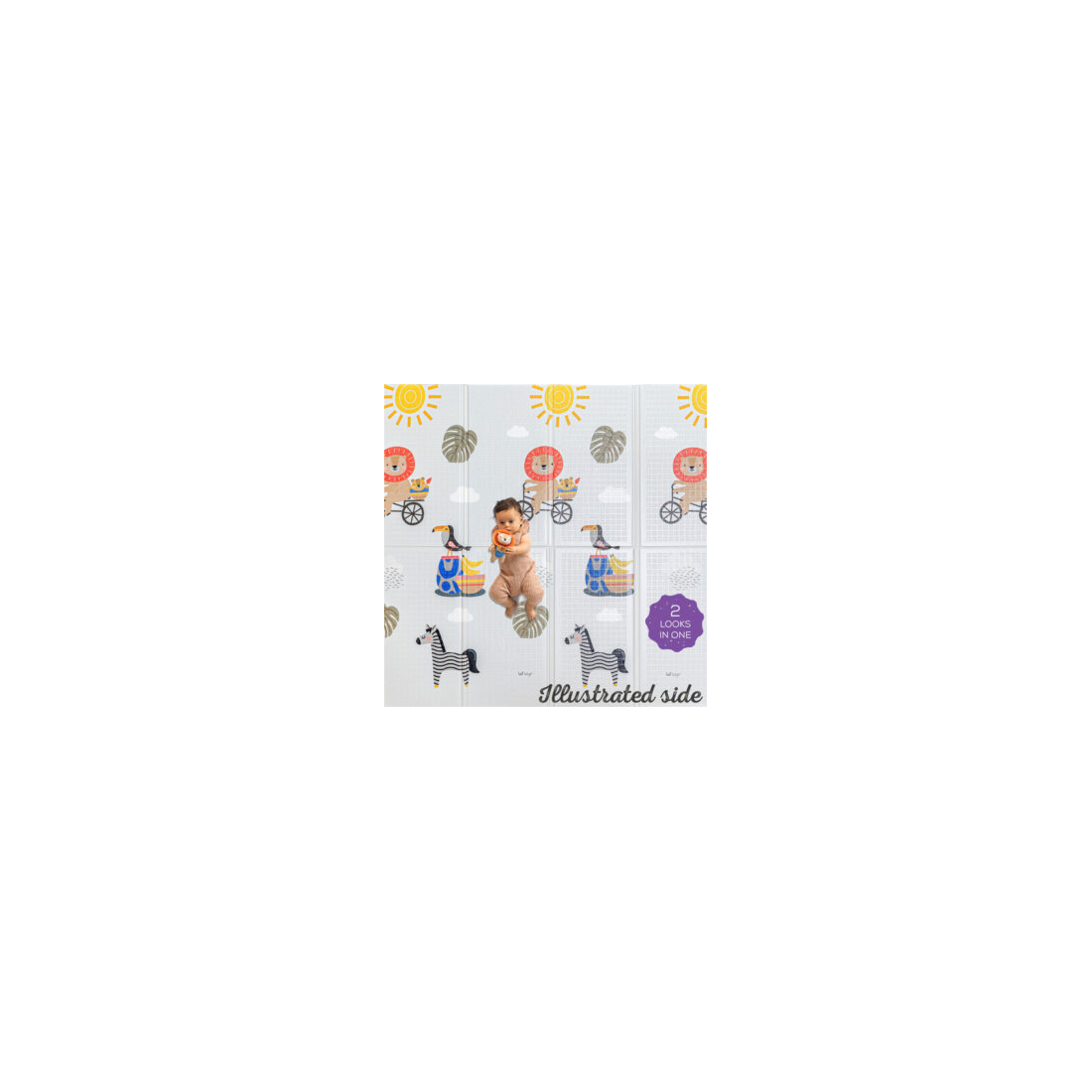 Περιλαμβάνει βρεφικό βιβλίο διπλής όψης για 2 στάδια ανάπτυξης, με την πρώτη πλευρά του βιβλίου με μεγάλες ασπρόμαυρες εικόνες υψηλής αντίθεσης για μωρά και στην άλλη πλευρά έγχρωμες εικόνες εκπαίδευσης. Αυτό το παχύ αφρώδες χαλάκι παρέχει έναν εξαιρετικά μεγάλο χώρο παιχνιδιού που λειτουργεί εξίσου καλά στο σαλόνι ή στο playroom.