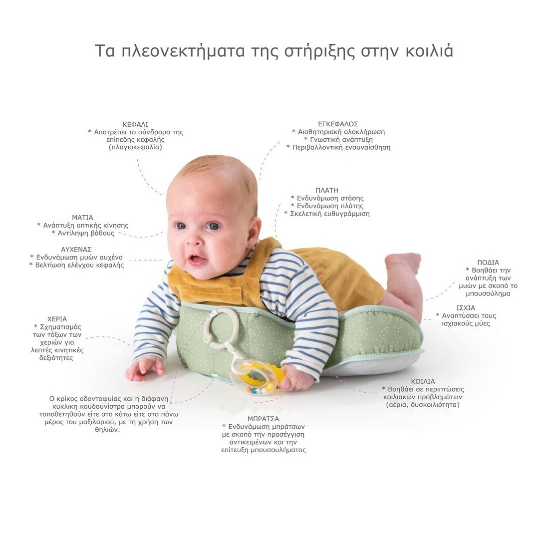 Μπορεί να βοηθήσει στην πρόληψη επίπεδων κηλίδων στο πίσω μέρος του κεφαλιού του μωρού καθώς και σε προβλήματα με την κοιλίτσα του, όπως αέρια και δυσκοιλιότητα.