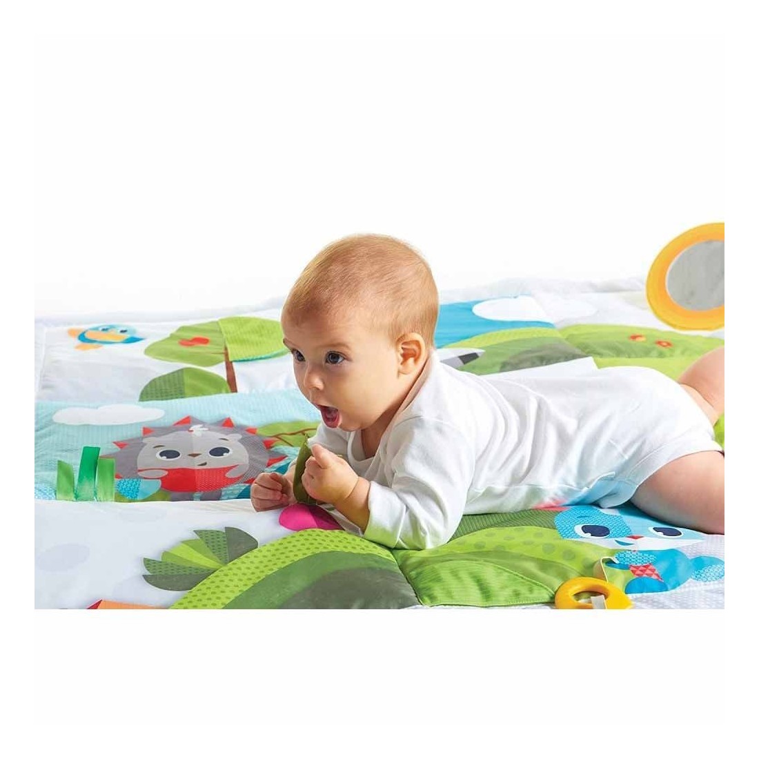 Πολύ μεγάλη επιφάνεια παιχνιδιού που εμπνέει την βρεφική περιέργεια και ενθαρρύνει την ανάπτυξη των κινητικών δεξιοτήτων. Ρυθμιζόμενο καθρεφτάκι που στέκεται μόνο του ενισχύσει την βρεφική ενασχόληση και την θέση μπρούμυτα του μωρού. Πολύ εύκολη αναδίπλωση και μεταφορά, κατάλληλο για χρήση εντός και εκτός σπιτιού. Το φαρδύ και ευρύχωρο μέγεθος του επιτρέπει στα μικρά παιδιά να τεντώσουν το σώμα τους και να ασκηθούν, να μετακινηθούν, να σταθούν μεγαλύτερο διάστημα στην θέση μπρούμυτα, και όταν αρχίσουν να κάθονται να απολαμβάνουν τις δραστηριότητες του χαλιού. Οι διαφορετικές υφές υφασμάτων και οι ήχοι που παράγονται από τα διάφορα παιχνιδάκια του τονώνουν και αναπτύσσουν τις βρεφικές αισθήσεις. Γενικά Χαρακτηριστικά: Περιλαμβάνει καθρεφτάκι και θέση velcro για να κρεμάσετε extra παιχνίδια.