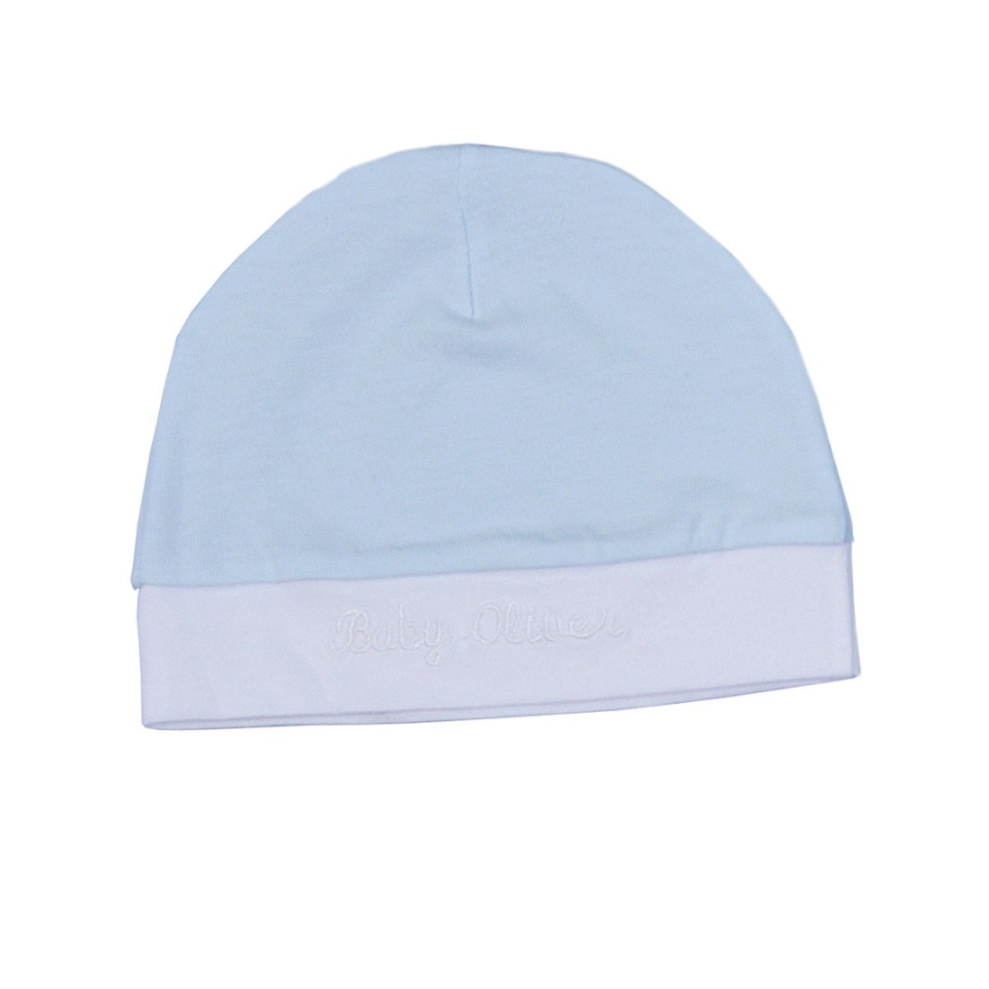Βρεφικό σκουφάκι από τη Baby Oliver, από ύφασμα ζέρσυ από 100% βαμβάκι πενιέ με πιστοποίηση Oekotex ζέρσευ σε χρώματα γαλάζιο-λευκό