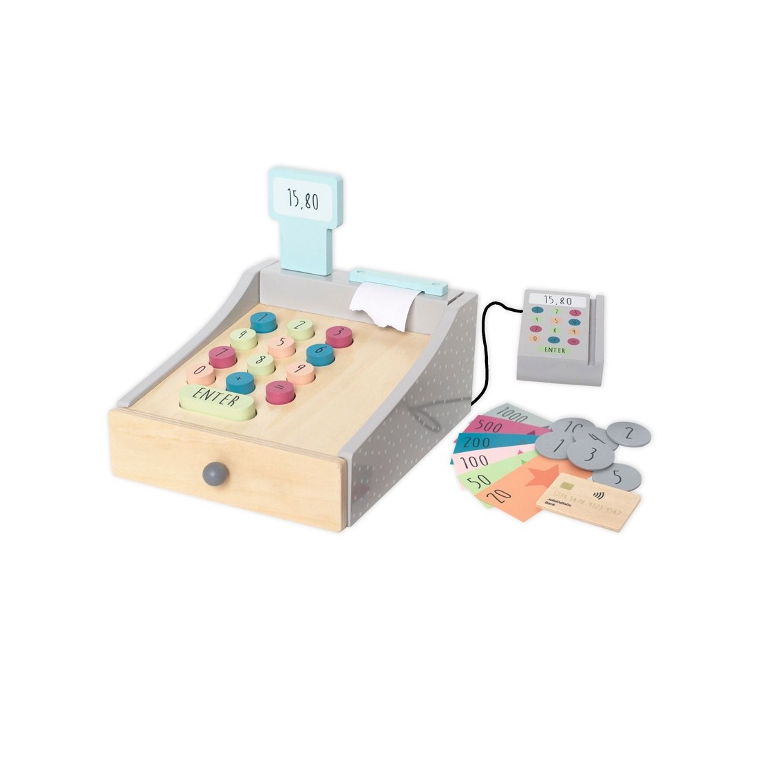Το ταμείο διαθέτει συρταράκι για τα χρήματα, scanner για τα προϊόντα, μηχάνημα για πιστωτική κάρτα και οθόνη για να φαίνεται η αξία των αγορών.