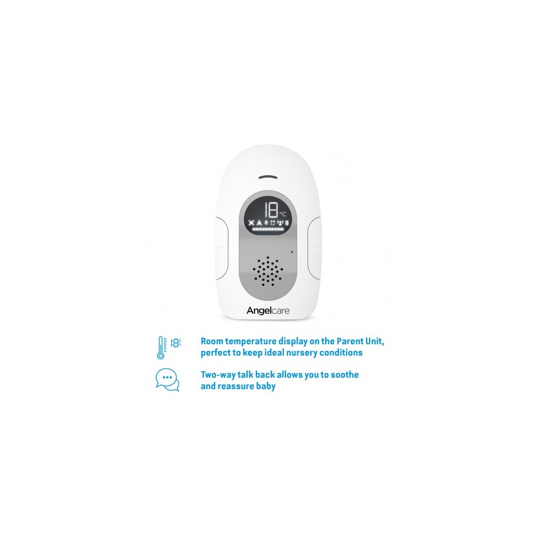 Διαθέτει δυνατότητα επικοινωνίας 2 δρόμων (talk back), μονάδα γονέα με θερμόμετρο και μονάδα βρέφους με χρωματική ένδειξη θερμοκρασίας Τεχνολογία SensAssureTM Technology
