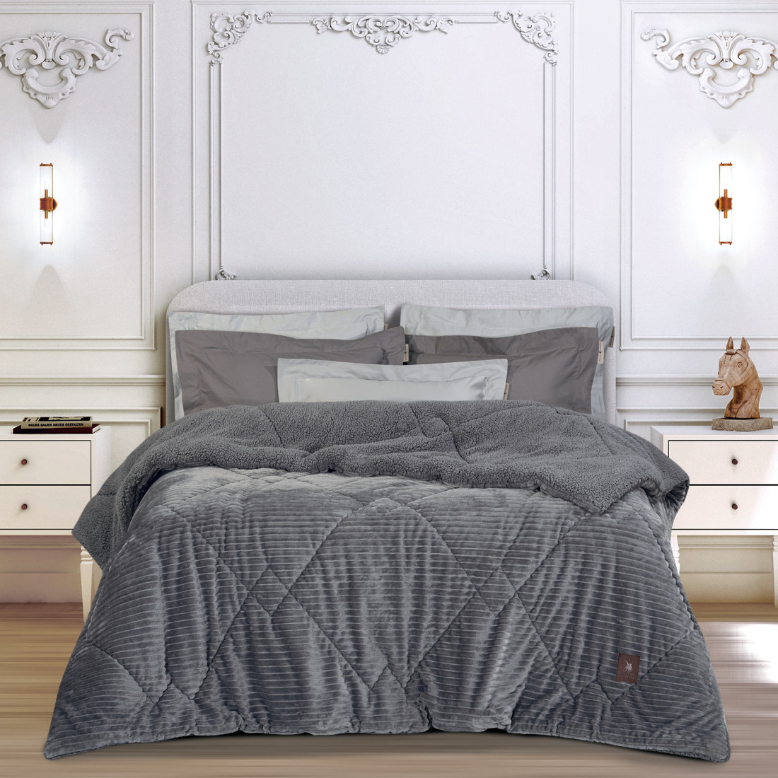 Κουβερτοπάπλωμα με sherpa του οίκου Greenwich Polo Club. Το πάνω μέρος είναι fleece 100% polyester. το κάτω μέρος είναι sherpa ενώ το εσωτερικό του γέμισμα είναι από 100% hollowfiber. Iδιαίτερα απαλό και ζεστό. με θερμότητα 11.5 Tog και βάρος 700gr/m². Προσφέρεται στη διάσταση 220X240εκ. Επιλέξτε Greenwich Polo Club για να απολαύσετε ποιότητα. στυλ και πολυτέλεια.-Πλύσιμο στους 30°C. Όχι σιδέρωμα. Όχι χρήση χλωρίου ή λευκαντικού. Όχι χρήση στεγνωτηρίου. Όχι στεγνό καθάρισμα.