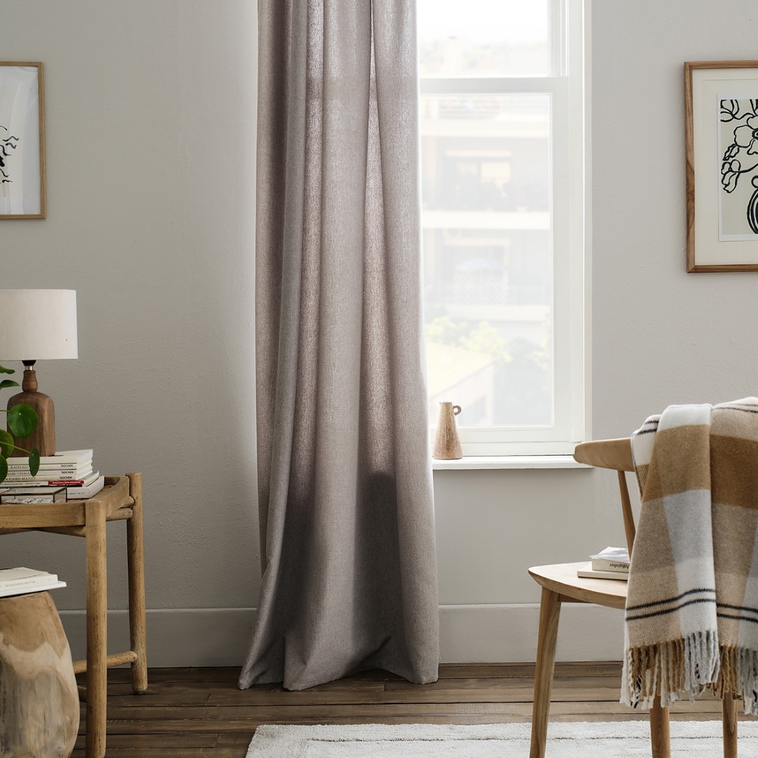 Μονόχρωμη κουρτίνα μεσαίας σκίασης, ιδανική για ριντό. Έτοιμη ραμμένη με ματ ασημί τρουκς.