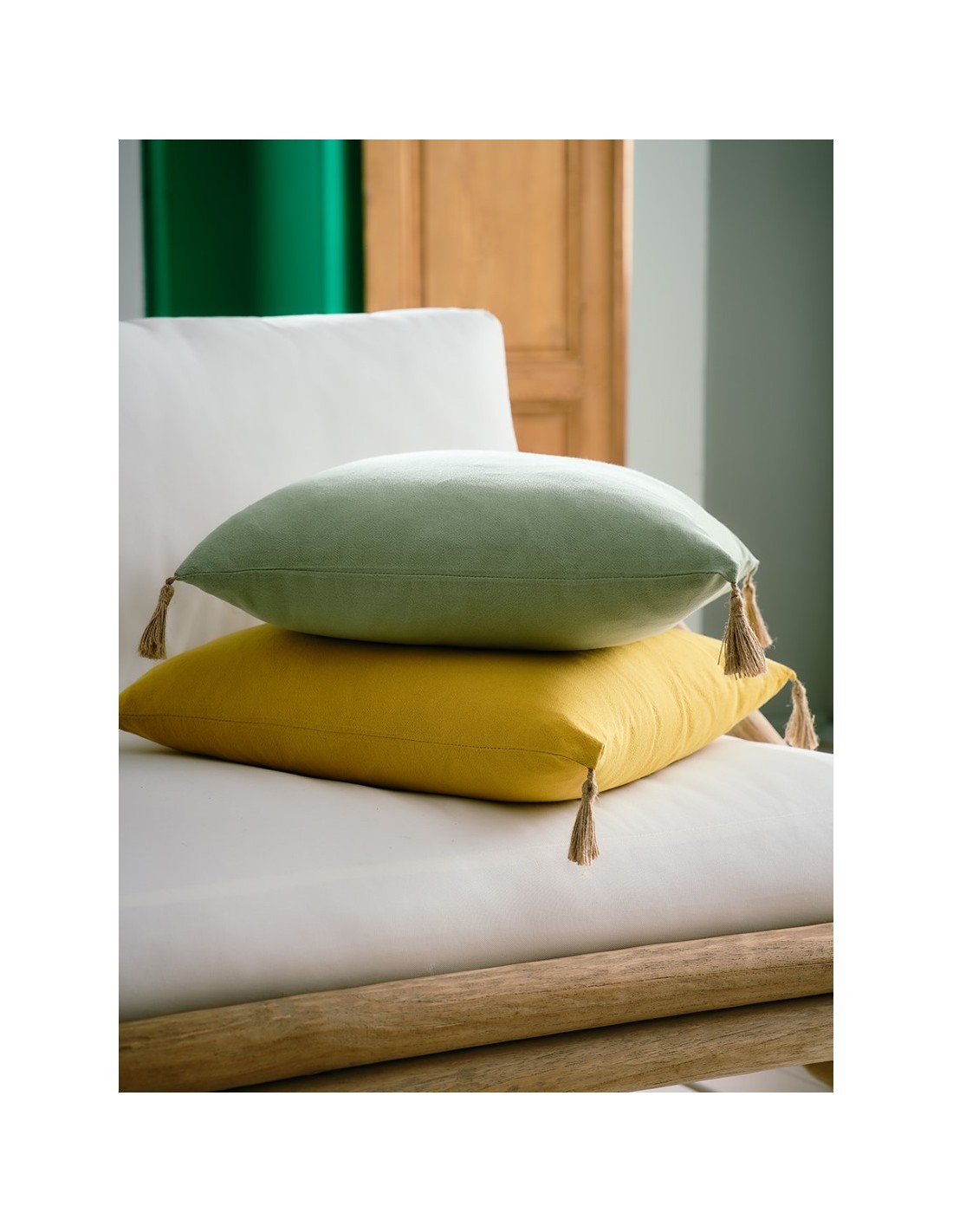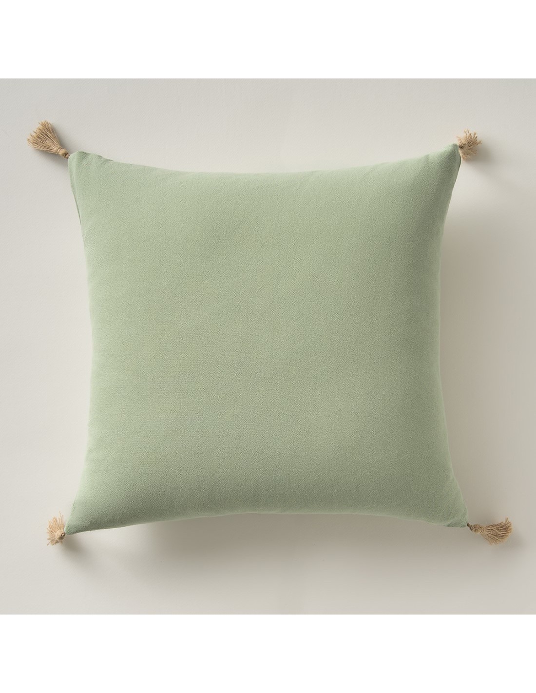 Μονόχρωμη μαξιλαροθήκη από πετροπλυμένο βαμβακερό ύφασμα με φυσικά φουντάκια από γιούτα.