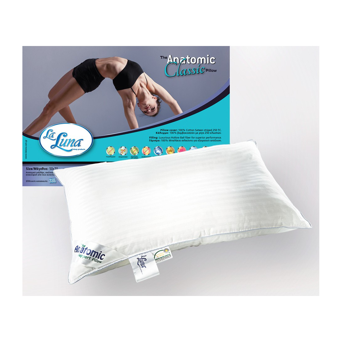 Μαξιλάρι ύπνου με σύνθεση από 100% βαμβακοσατέν ύφασμα και μπαλάκια σιλικόνης για σωστή υποστήριξη του αυχένα. Έχει μέτρια προς σταθερή σκληρότητα. η οποία το καθιστά ιδανικό για όσους κοιμούνται ανάσκελα ή στο πλάι. Υποαλλεργικό·Αντιβακτηριακό·Διατηρεί το σχήμα του·Επαναφορά όγκου. Ύφασμα: 100% βαμβακοσατέν με ρίγα 250 κλωστών. αδιαπέραστο. Περιεχόμενο: 100% μπαλάκια σιλικόνης για εξαιρετική απόδοση.