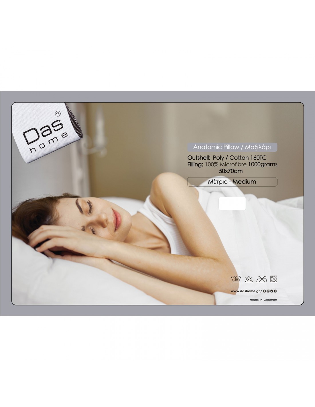 Ανατομικό μαξιλάρι μέτριας σκληρότητας, βάρους 1000 γραμμαρίων. Το εξωτερικό ύφασμα είναι poly/cotton 160TC, ενώ το εσωτερικό του αποτελείται από 100% microfiber. Διατίθεται σε διάσταση 50X70 Das home...makes your house a home!
