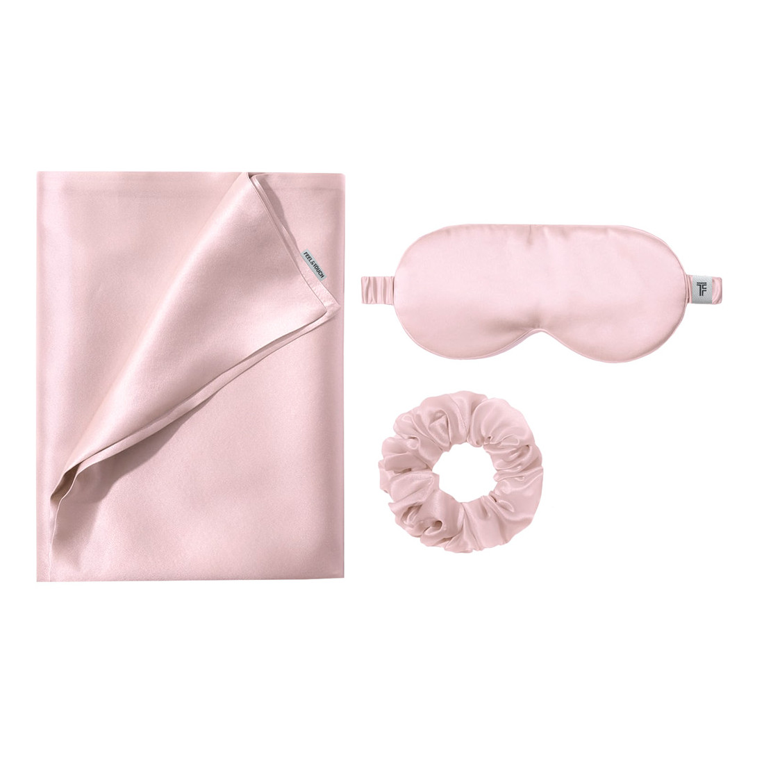 Σετ 3 τεμαχίων \"Beauty Sleep\"" αποτελούμενο από μία μαξιλαροθήκη, μάσκα ύπνου και scrunchie (λαστιχάκι μαλλιών) με την υπογραφή της FEEL & TOUCH. Το σετ είναι κατασκευασμένο από 100% Mulberry Silk, από τα καλύτερα ήδη μεταξιού στον κόσμο. Ιδανικό για να αναβαθμίσετε την ποιότητα του ύπνου σας, των μαλλιών σας και της επιδερμίδας σας. Ανακαλύψτε όλα τα χρώματα της συλλογής \""Beauty Sleep\"". "