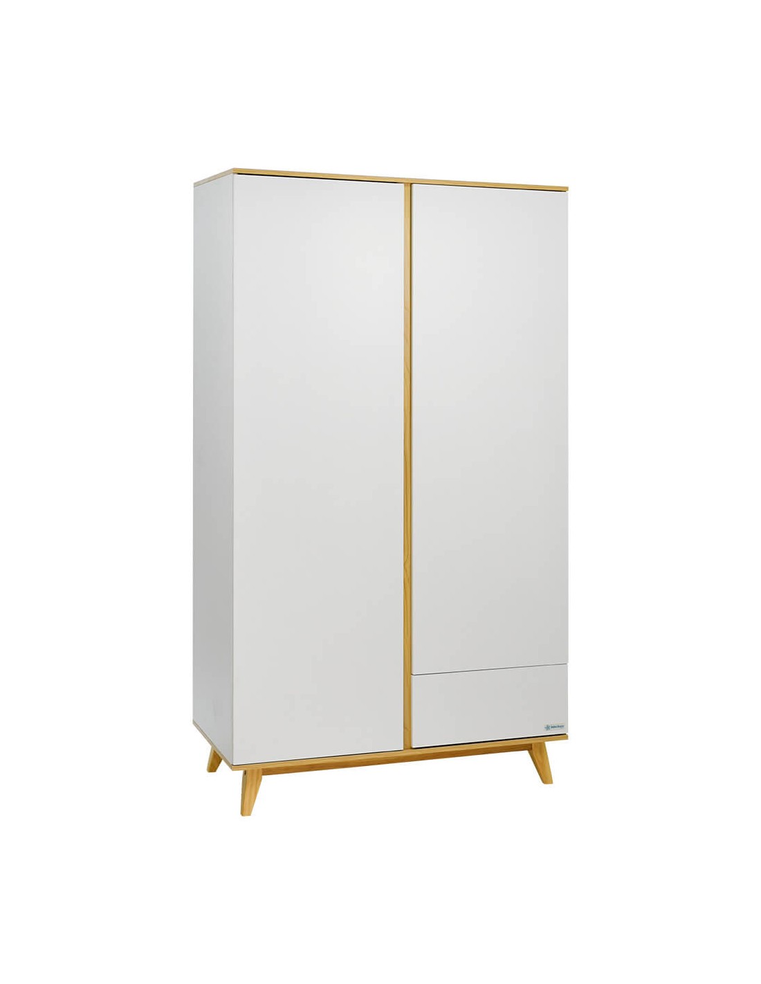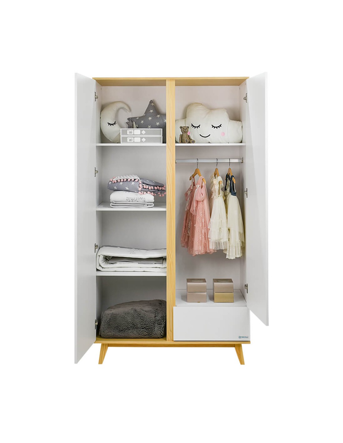 Μοντέρνα δίφυλλη ντουλάπα η οποία διαθέτει, δυο μεγάλες πόρτες, πέντε μεγάλα ράφια, ένα συρτάρι και μία βέργα κρέμασης.
