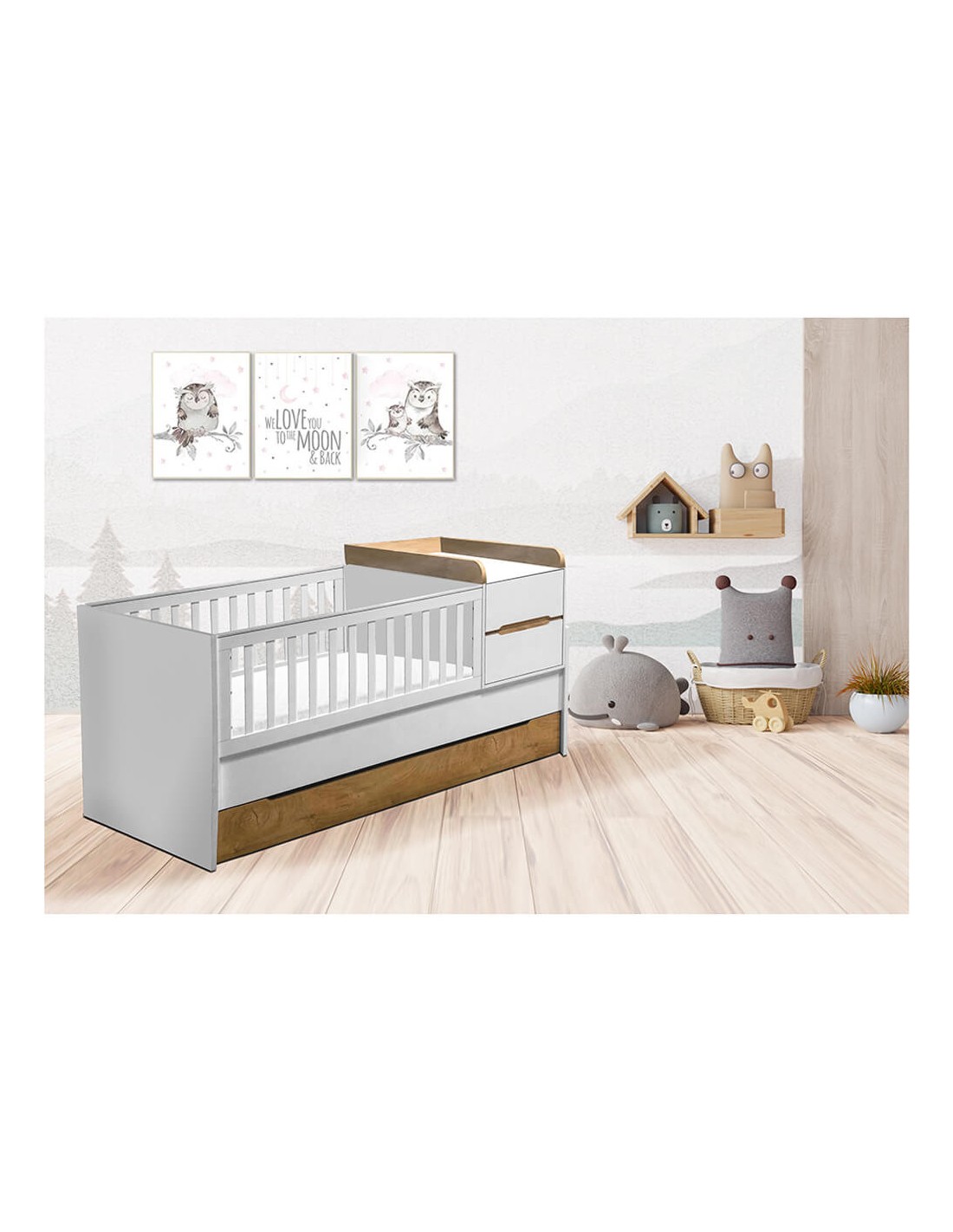 Ακόμη, έχει ενσωματωμένη συρταριέρα-αλλαξιέρα με δύο μικρότερα συρτάρια για την αποθήκευση των απαραίτητων προϊόντων του μωρού σας και στο πίσω μέρος διαθέτει μεγάλο μπαούλο για αποθηκευτικό χώρο. Όταν το μωρό σας αρχίσει να μεγαλώνει μπορεί να μετατραπεί η συρταριερα - αλλαξιέρα σε κομοδίνο με δυο συρτάρια.