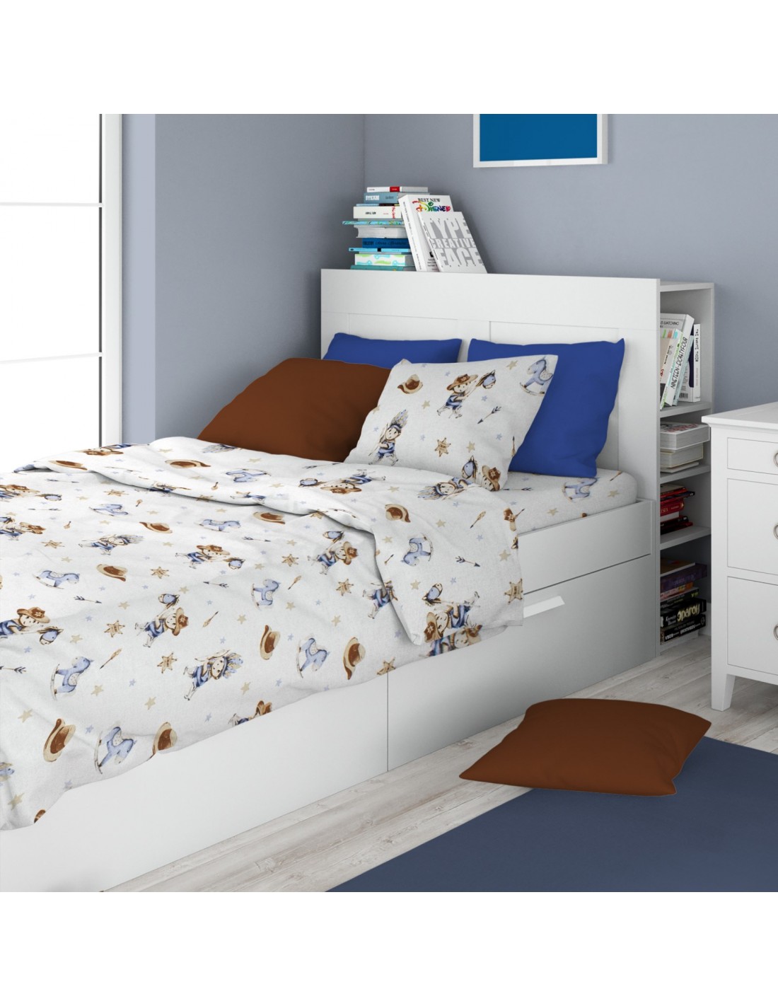 Παιδικό σετ σεντόνια 3 τεμαχίων που περιέχει: 2 σεντόνια για μονό κρεβάτι διαστάσεων 160x240 και 1 μαξιλαροθήκη διαστάσεων 50x70. Κατασκευασμένο από 100% βαμβακερό ύφασμα 144 κλωστών. Εμπριμέ με χαρούμενα χρώματα και παραστάσεις. Κατασκευάζεται στην Ελλάδα. Συσκευασία δίπτυχο Polybag.