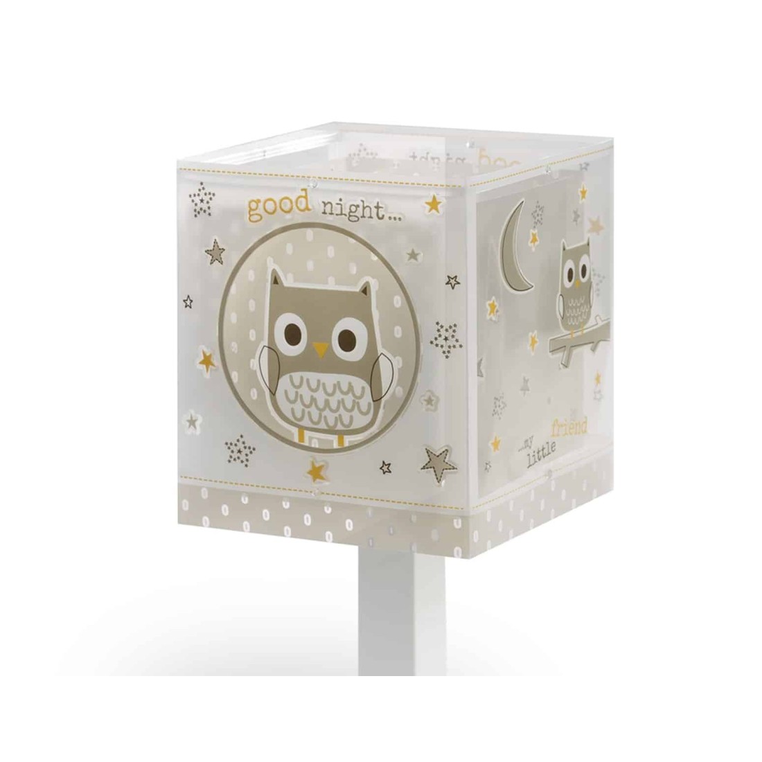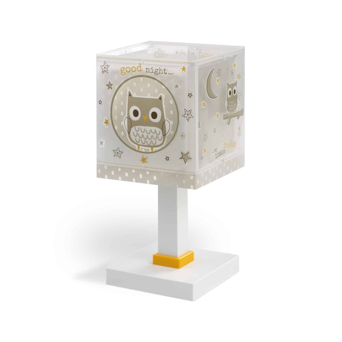 Κλασικής σχεδίασης παιδικό φωτιστικό κομοδίνου. Διπλού τοιχώματος με διάφανα εξωτερικά μέρη. Φωσφορίζοντα εξωτερικά μέρη στο σκοτάδι. Διακόπτης on / off επάνω στο καλώδιο. Συνθετικό υλικό αντοχής πολυπροπυλενίου. Ιδανικό για γραφείο ή κομοδίνο. Τύπος ντουί E14 με θέση για έναν λαμπτήρα. Κατασκευασμένο εξ ολοκλήρου στην Ευρώπη. Ανθεκτικό στα χτυπήματα και τις πτώσεις. Απόλυτα συμβατό με τις ευρωπαϊκές προδιαγραφές ασφαλείας. Το Good Night κομοδίνου φωτιστικό συμπληρώνει τα υπόλοιπα παιδικά φωτιστικά της συλλογής.
