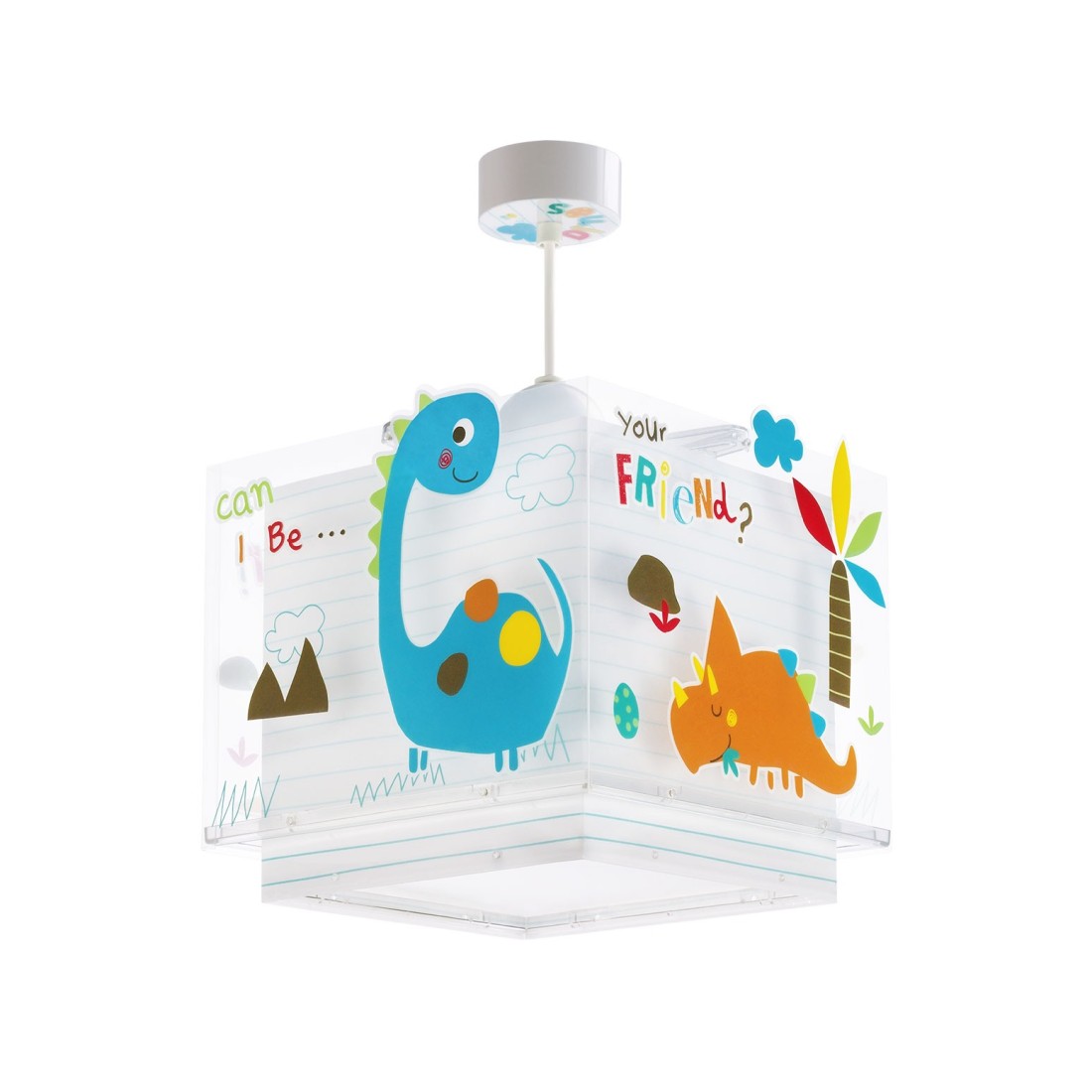 Κρεμαστό παιδικό φωτιστικό οροφής, με θέμα τα δεινοσαυράκια, κατάλληλο για γενικό φωτισμό. Διπλού τοιχώματος με διάφανο εξωτερικό τοίχωμα & φωσφορίζοντα στο σκοτάδι μέρη. Συνθετικό υλικό αντοχής πολυπροπυλενίου, διάφανα μέρη στήριξης για φωτισμό χωρίς σκιές. Κιτ ανάρτησης με διακοσμημένη ροζέτα ρυθμιζόμενο στο ύψος. Παρέχεται διαχυτής φωτός για ομοιόμορφο φωτισμό. Κατασκευασμένο εξ ολοκλήρου στην Ευρώπη. Το Dinos φωτιστικό οροφής συμπληρώνει τα υπόλοιπα παιδικά φωτιστικά της συλλογής.