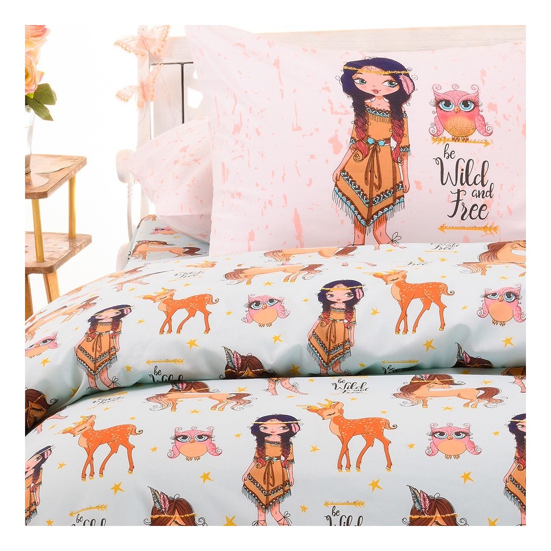Παιδική παπλωματοθήκη Indian Girl με εμπριμέ σχέδιο από τη σειρά Kids Line! Κατασκευασμένη από 100% βαμβακερό ύφασμα 144 κλωστών, έχει μοναδικά απαλή υφή και λείο φινίρισμα, ενώ παράλληλα είναι πολύ εύκολη στο σιδέρωμα. Αποτελεί την ιδανική επιλογή για άνετο και υγιεινό ύπνο, κάθε εποχή του χρόνου.