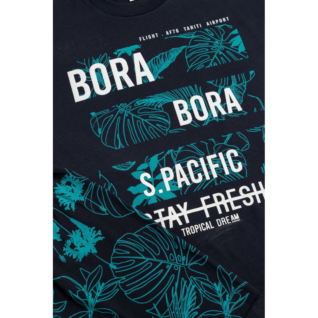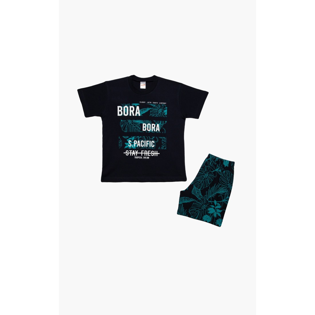 Παιδική θερινή πιτζάμα για αγόρι από 100% απαλό βαμβακερό ύφασμα υψηλής ποιότητας. Το σετ περιλαμβάνει κοντομάνικη μονόχρωμη μπλούζα με στρογγυλή λαιμόκοψη, tropical τύπωμα και εμπριμέ tropical σορτς με ελαστική μέση. Συνδυάστε με τις αντίστοιχες ανδρικές πιτζάμες και δημιουργήστε το απόλυτο father & son look.