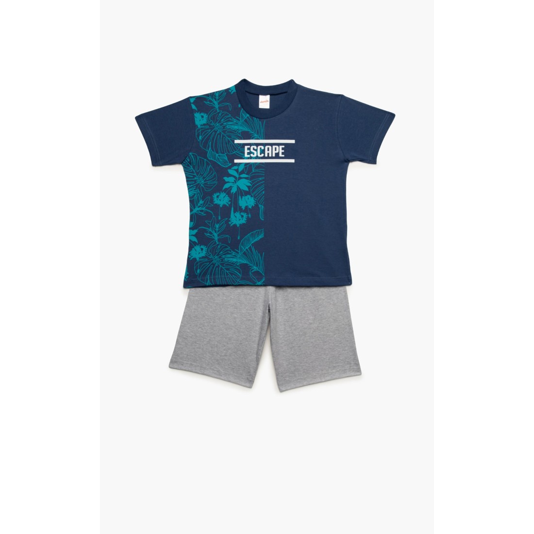 Παιδική θερινή πιτζάμα για αγόρι από 100% απαλό βαμβακερό ύφασμα υψηλής ποιότητας. Το σετ περιλαμβάνει κοντομάνικη μονόχρωμη μπλούζα με στρογγυλή λαιμόκοψη, tropical τύπωμα και μονόχρωμη βερμούδα με ελαστική μέση. Συνδυάστε με τις αντίστοιχες ανδρικές πιτζάμες και δημιουργήστε το απόλυτο father & son look.