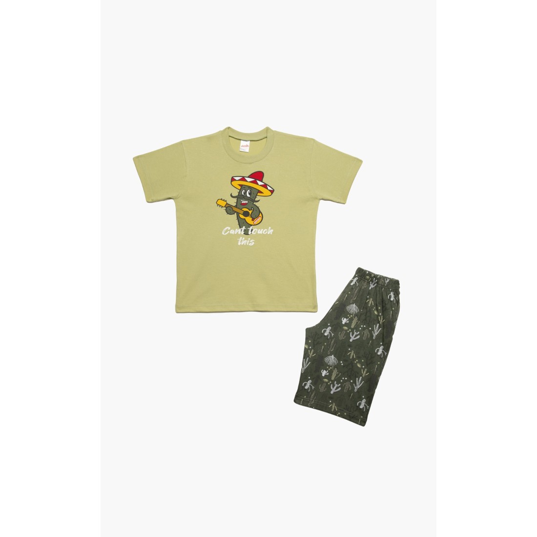 Παιδική θερινή πιτζάμα για αγόρι από 100% απαλό βαμβακερό ύφασμα υψηλής ποιότητας. Το σετ περιλαμβάνει κοντομάνικη μονόχρωμη μπλούζα με στρογγυλή λαιμόκοψη, χιουμοριστικό τύπωμα και εμπριμέ βερμούδα με ελαστική μέση. Συνδυάστε με τις αντίστοιχες ανδρικές πιτζάμες και δημιουργήστε το απόλυτο father & son look.