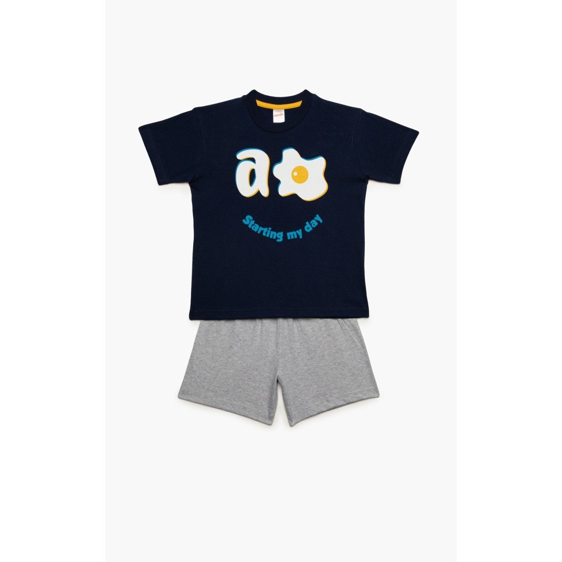 Παιδική θερινή πιτζάμα για αγόρι από 100% απαλό βαμβακερό ύφασμα υψηλής ποιότητας. Το σετ περιλαμβάνει κοντομάνικη μονόχρωμη μπλούζα με στρογγυλή λαιμόκοψη, χιουμοριστικό τύπωμα και μονόχρωμο σορτς με ελαστική μέση. Συνδυάστε με τις αντίστοιχες ανδρικές πιτζάμες και δημιουργήστε το απόλυτο father & son look.