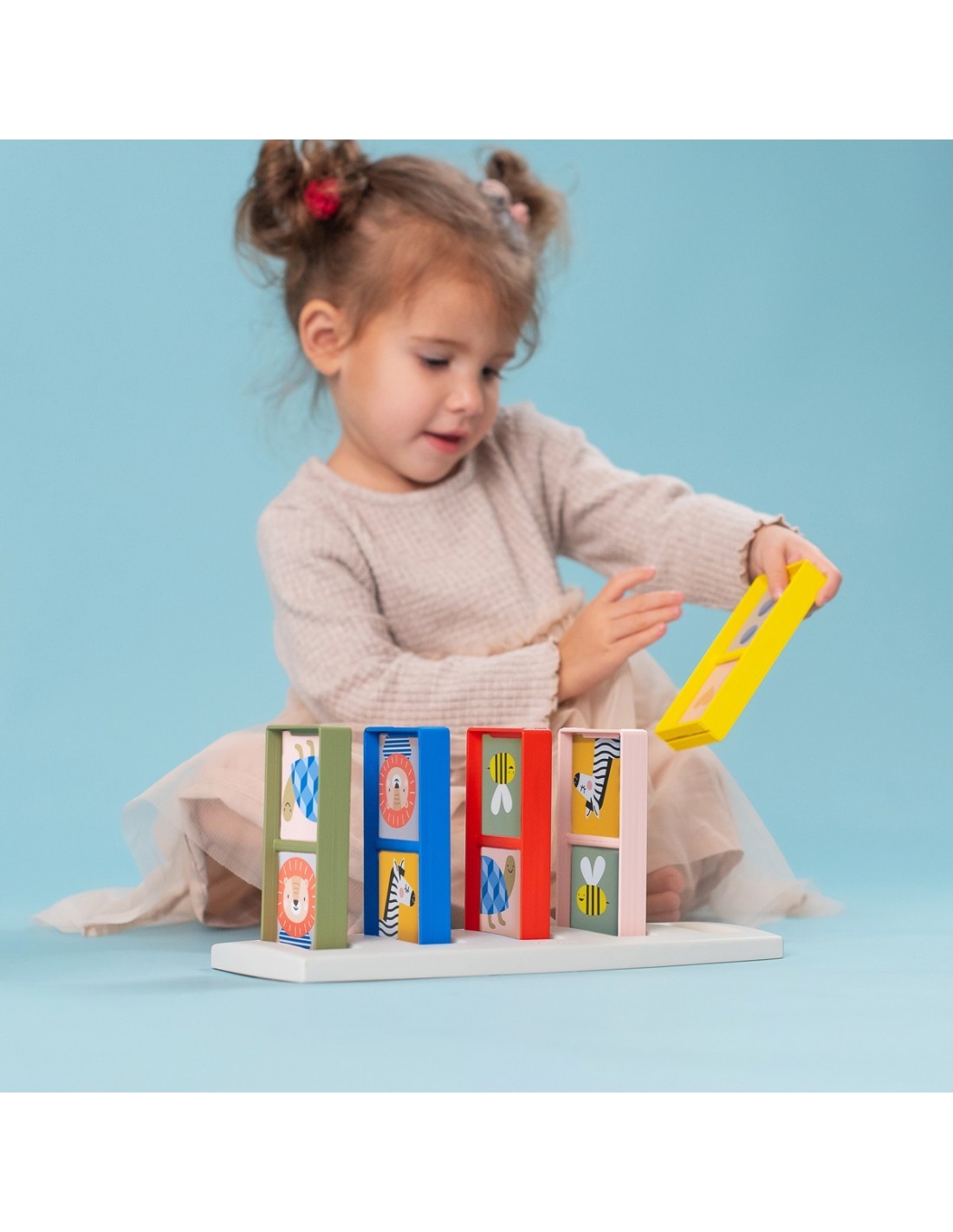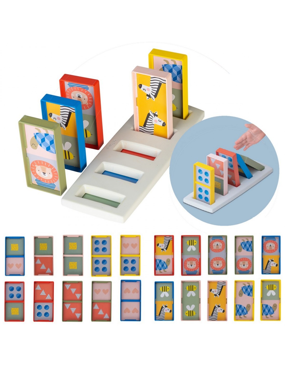 24M Η αντιστοίχιση ποσοτήτων και σχημάτων βοηθά το νήπιο να αναγνωρίσει σχέδια, να ονομάσει βασικά σχήματα και να εξοικειωθεί με τη μέτρηση. Η αντιστοίχιση των χρωμάτων του ντόμινο στην χρωματική υποδοχή ,υποστηρίζει την γνωστική ανάπτυξη μέσω της αναγνώρισης χρωμάτων και της ικανότητας αντιστοίχισης.