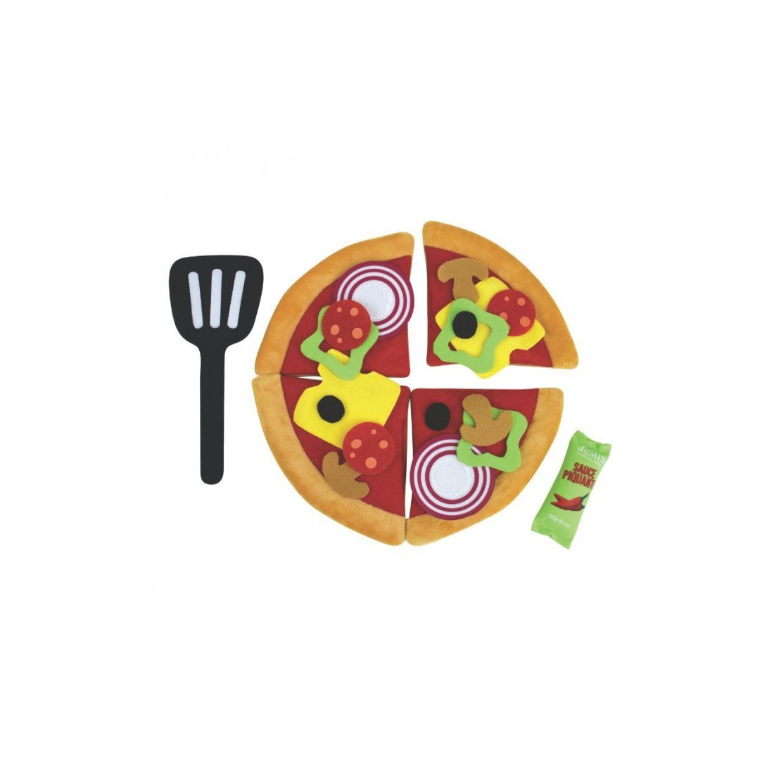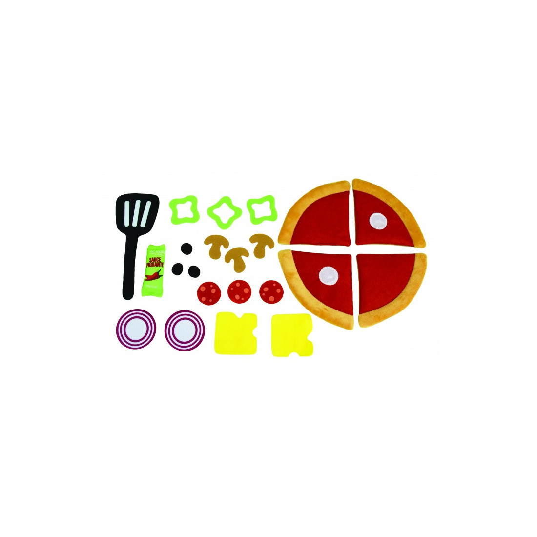 Ένα απολαυστικό υφασμάτινο παιχνίδι μίμησης! Κολλήστε όλα τα συστατικά πάνω στις φέτες της πίτσας με Velcro, και δημιουργήστε γευστικότατες πίτσες με βάση τις λιγούρες σας και την ατέλειωτη φαντασία σας!