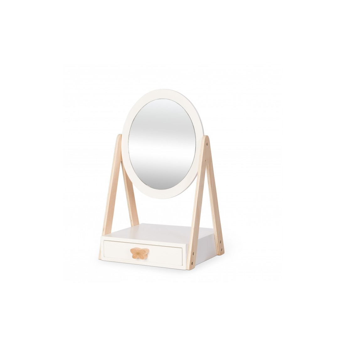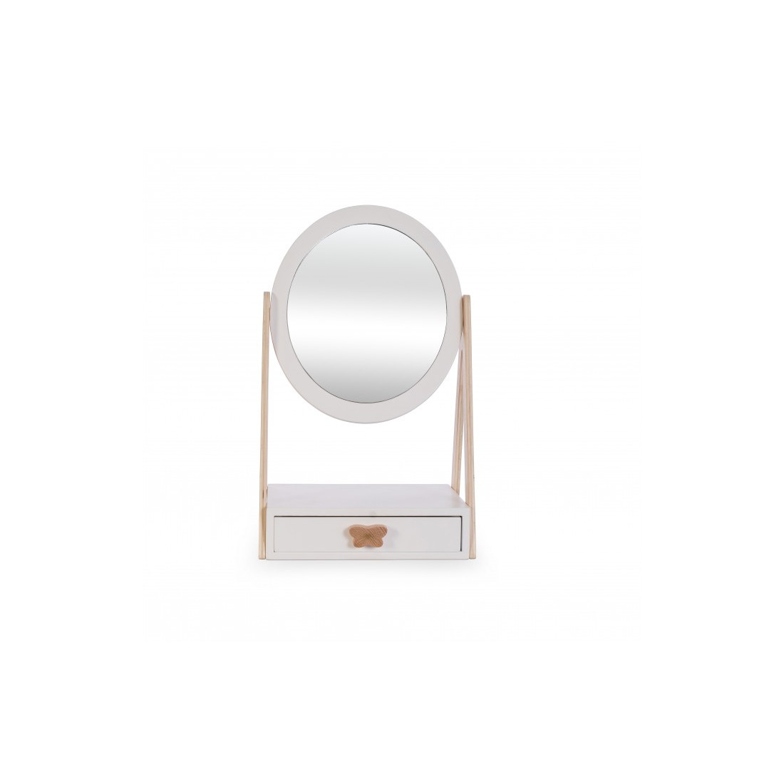 Ένας ανακλινόμενος καθρέφτης κατασκευασμένος, για λόγους ασφαλείας, από ακρυλικό και ένα συρτάρι στο κάτω μέρος του – ένα τέλειο μέρος αποθήκευσης για τα αγαπημένα σας αξεσουάρ.
