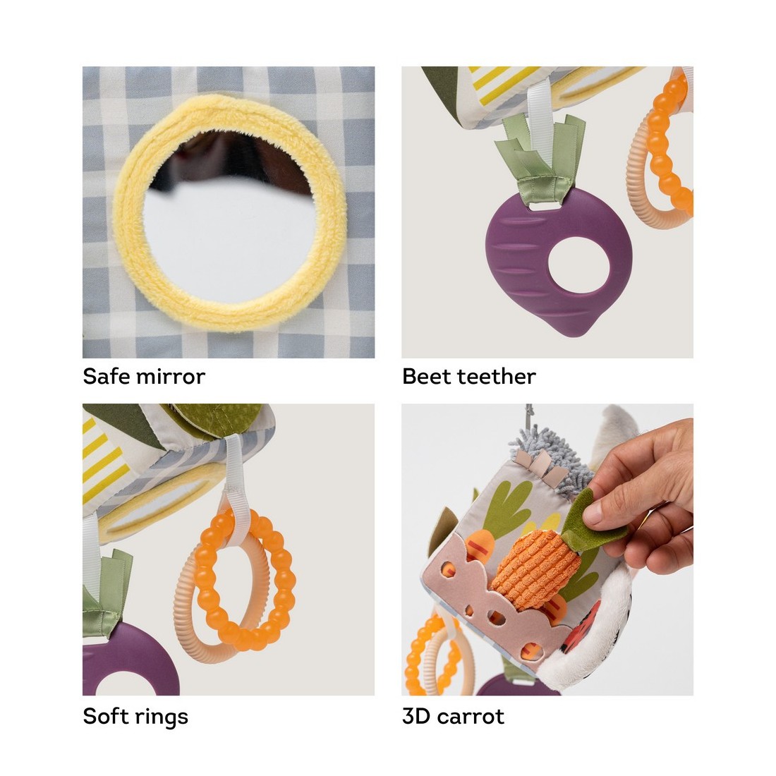 Με μια σειρά από ενδιαφέροντα χαρακτηριστικά, αυτός ο κύβος ενθαρρύνει την ανακάλυψη μέσω της όρασης, της αφής και του ήχου. Περιλαμβάνει ένα λουλούδι εμφάνισης-απόκρυψης, καθρέφτη ασφαλή για μωρά, μαλακό παιχνίδι οδοντοφυΐας σε σχέδιο παντζαριού, αυτιά κουνελιού που τσακίζουν, κρίκους με ήχους, διαφορετικές υφές υφασμάτων, τσακιστό καρότο και πολλά άλλα, καθιστώντας το, ένα από τα καλύτερα βρεφικά παιχνίδια.