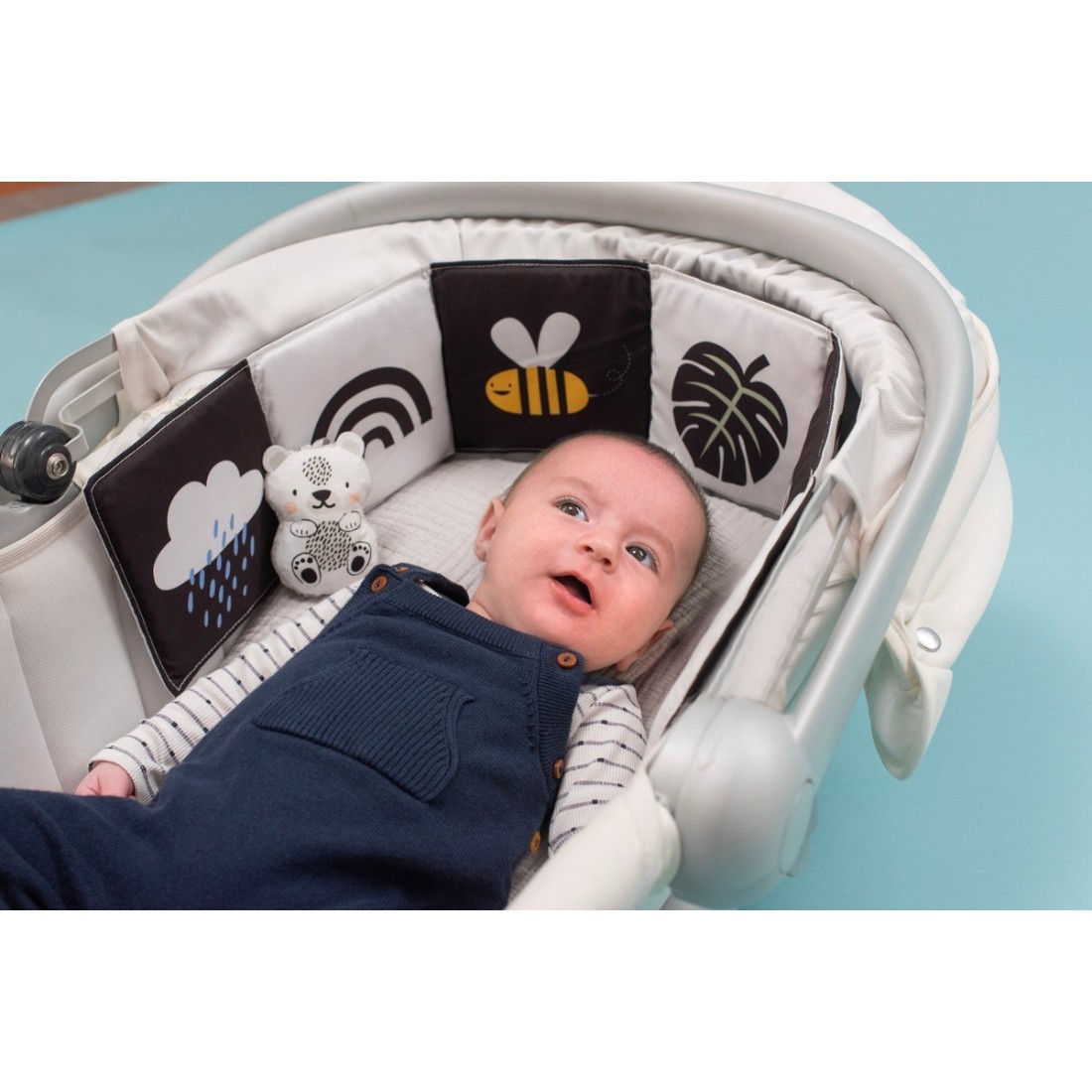 Πλευρά 2) Σύνθετες εικόνες, μοτίβα και πρόσωπα, ένας βρεφικός ασφαλής καθρέπτης, τσαλακωμένο γέμισμα και νεογέννητο ζωάκι προσφέρουν οπτική διέγερση & αναπτύσσουν τις αισθήσεις του μωρού και την συναισθηματική του νοημοσύνη.