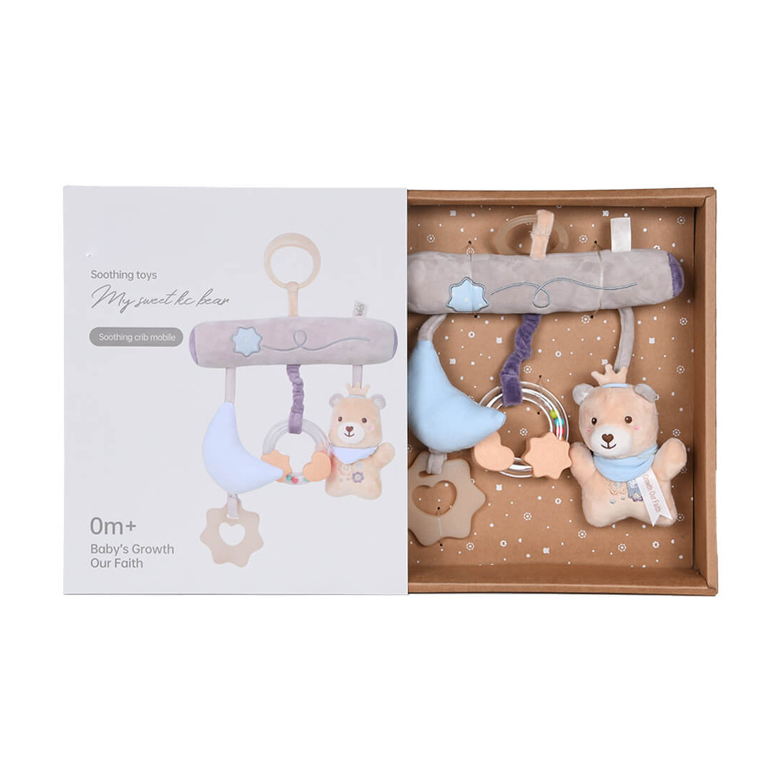 – 3 κρεμαστά παιχνίδια με όμορφα σχέδια και χρώματα, κουδουνίστρες και μασητικά.