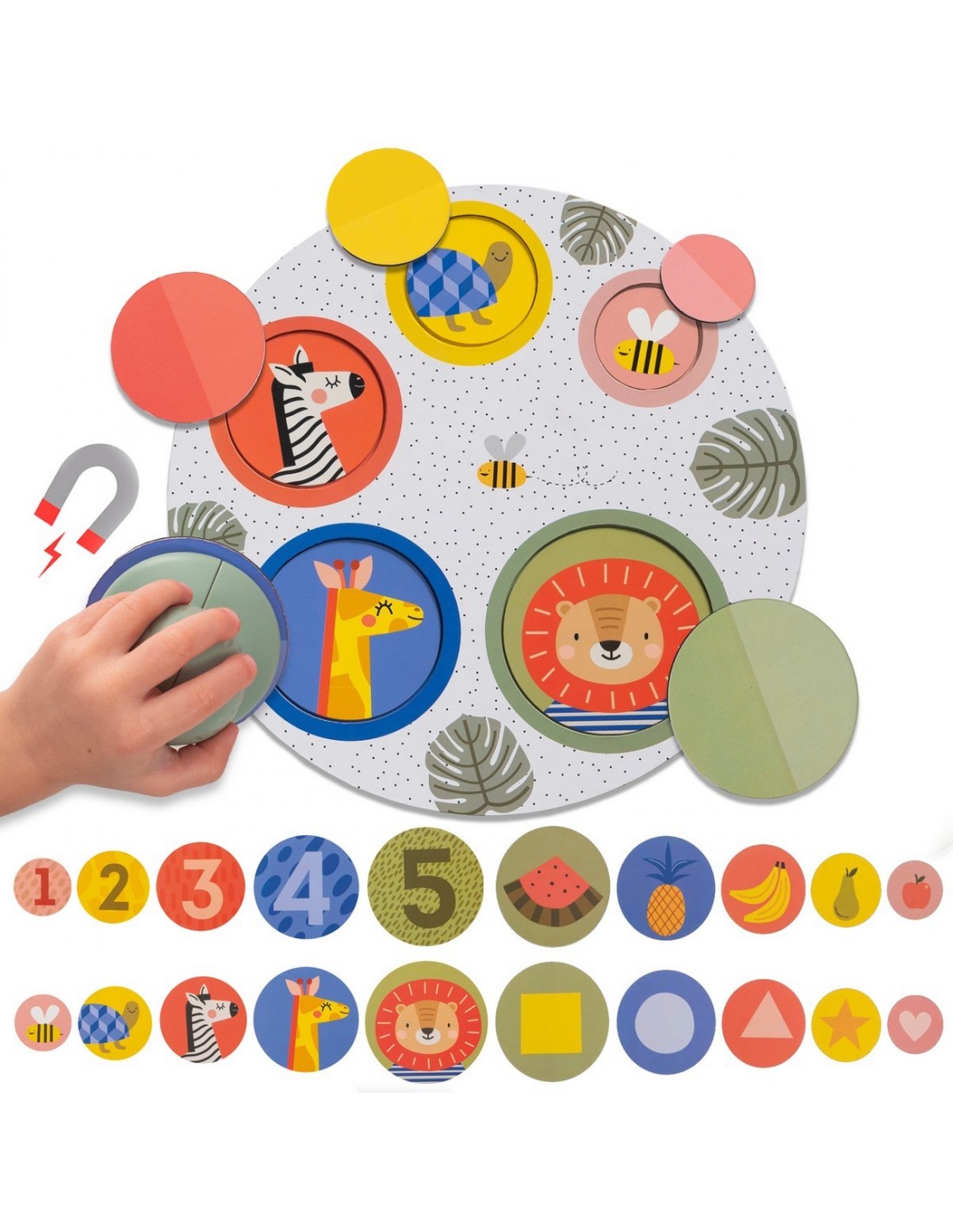 18 Ταιριάξτε τους μαγνητικούς κύκλους στον πίνακα, καθώς ονομάζετε και αντιστοιχείτε τα χρώματα στις  υποδοχές και ζητήστε από το παιδί με τον μαγικό μαγνήτη  να αφαιρέσει  τα καλύμματα και να αποκαλύψει  τις εκπλήξεις που κρύβονται από κάτω! Καθώς το παιδί σας ανοίγει τα καλύμματα, ονομάστε την εικόνα που  κρύβεται από κάτω και μιλήστε του σχετικά με αυτή.
