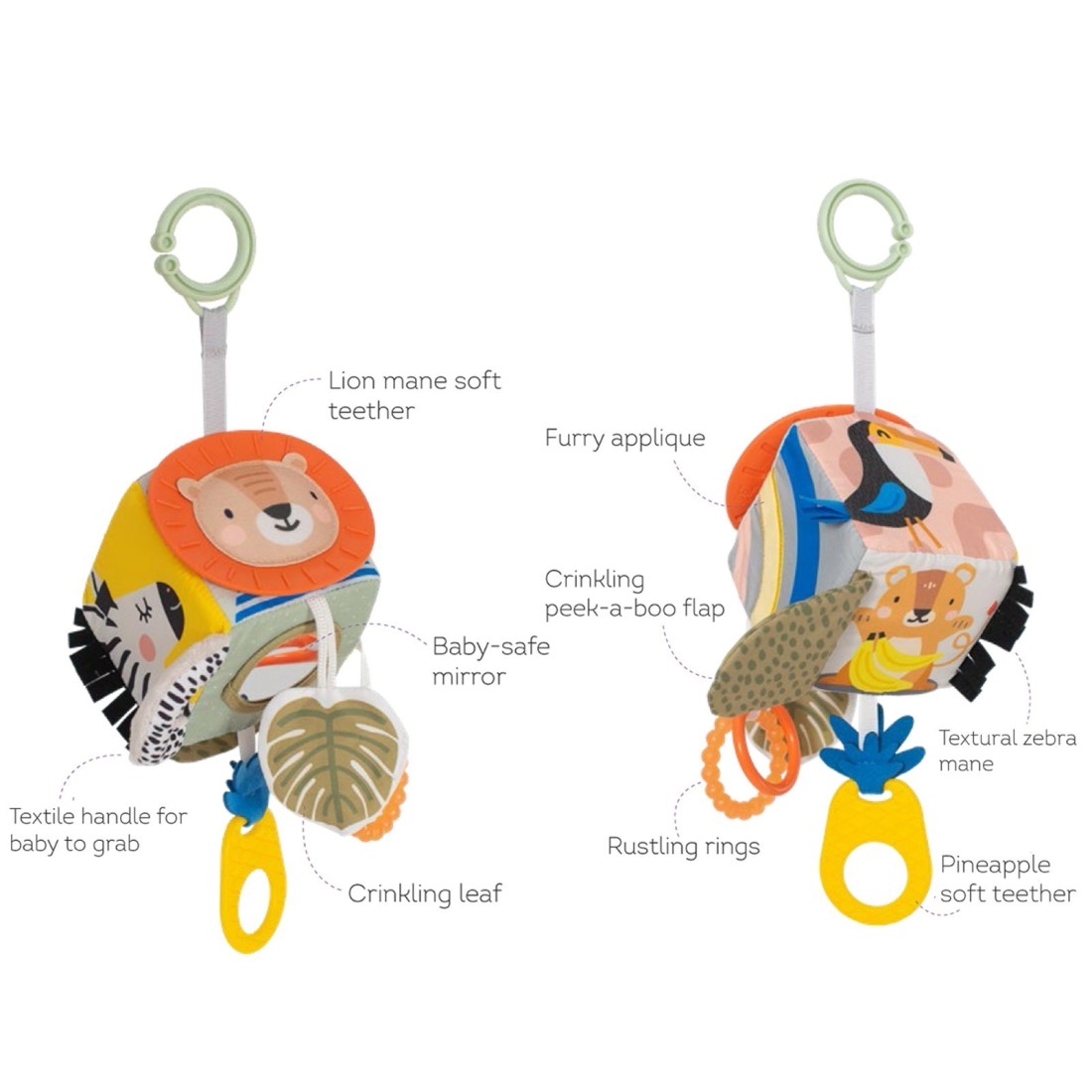 Το μαλακό παιχνίδι κύβος περιλαμβάνει, μασητικό οδοντοφυΐας, βρεφικό καθρέφτη ασφαλείας, κορδέλες, κρίκους , υφάσματα με ήχο θροΐσματος και τμήματα υφασμάτων με πτυχώσεις και εικόνες που προωθούν την έννοια της απόκρυψης-εμφάνισης.