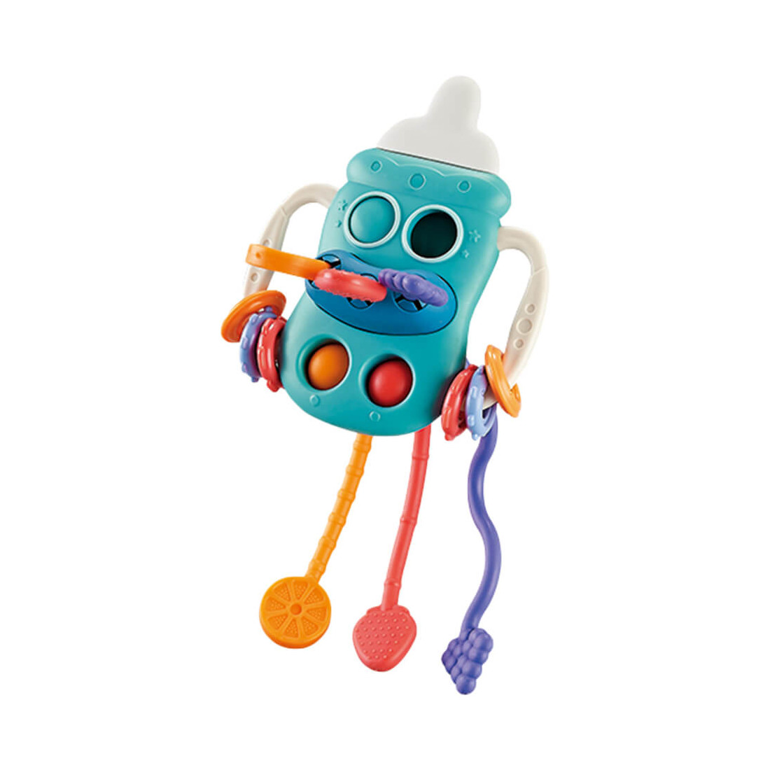 Το παιχνιδάκι bottle είναι ένα πολύ-λειτουργικό αισθητηριακό παιχνίδι, το οποίο μπορεί να χρησιμοποιηθεί από παιδάκια 18+ μηνών. Μπορούν να παίξουν με 5 διαφορετικούς τρόπους με σκοπό να ασκήσουν την ευελιξία στα χέρια τους. Μπορούν να τραβήξουν τα πολύχρωμα μαλακά σχοινιά με τα φρούτα, να πιέσουν “φούσκες”, να σύρουν μια σφαίρα και να παίζουν με τα πλαϊνά κρεμαστά εξαρτήματα. Μέσα από το παιχνίδι μαθαίνουν να ξεχωρίζουν σχήματα και χρώματα.