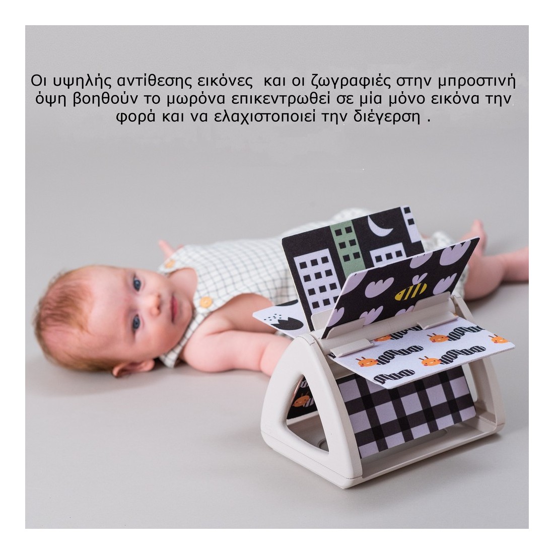 Το τέλειο αναπτυξιακό παιχνίδι για μωρά. Ένα βιβλίο με διπλής όψεως περιστρεφόμενες σελίδες, κατασκευασμένο για 3 στάδια ανάπτυξης με ασπρόμαυρες και πολύχρωμες εικονογραφήσεις.