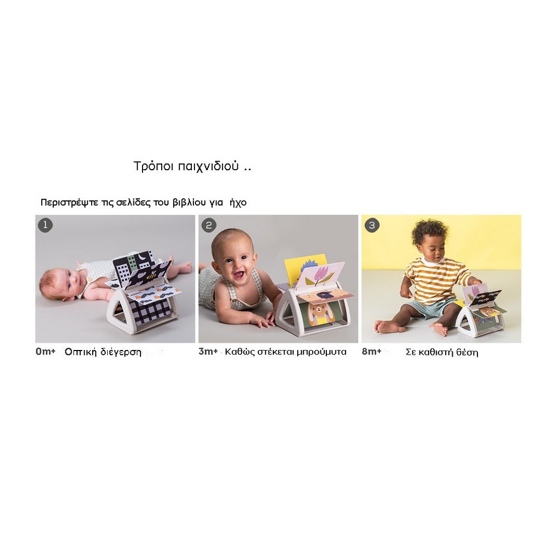 Το μοναδικό χαρακτηριστικό αυτού του παιχνιδιού είναι ότι δημιουργεί έναν κροτάλισμα κατά την περιστροφή των σελίδων του βιβλίου, που διδάσκει την αιτία και το αποτέλεσμα και καθώς στέκεται μόνο του, ενθαρρύνει τον χρόνο που στέκεται το μωρό στην κοιλίτσα του διεγείροντας τις αισθήσεις και την ανάπτυξη της όρασης του μωρού. Τα ασπρόμαυρα μοτίβα υψηλής αντίθεσης είναι τέλεια για νεογέννητα και μικρά βρέφη, καθώς βοηθούν στην τόνωση και την ανάπτυξη της όρασής.