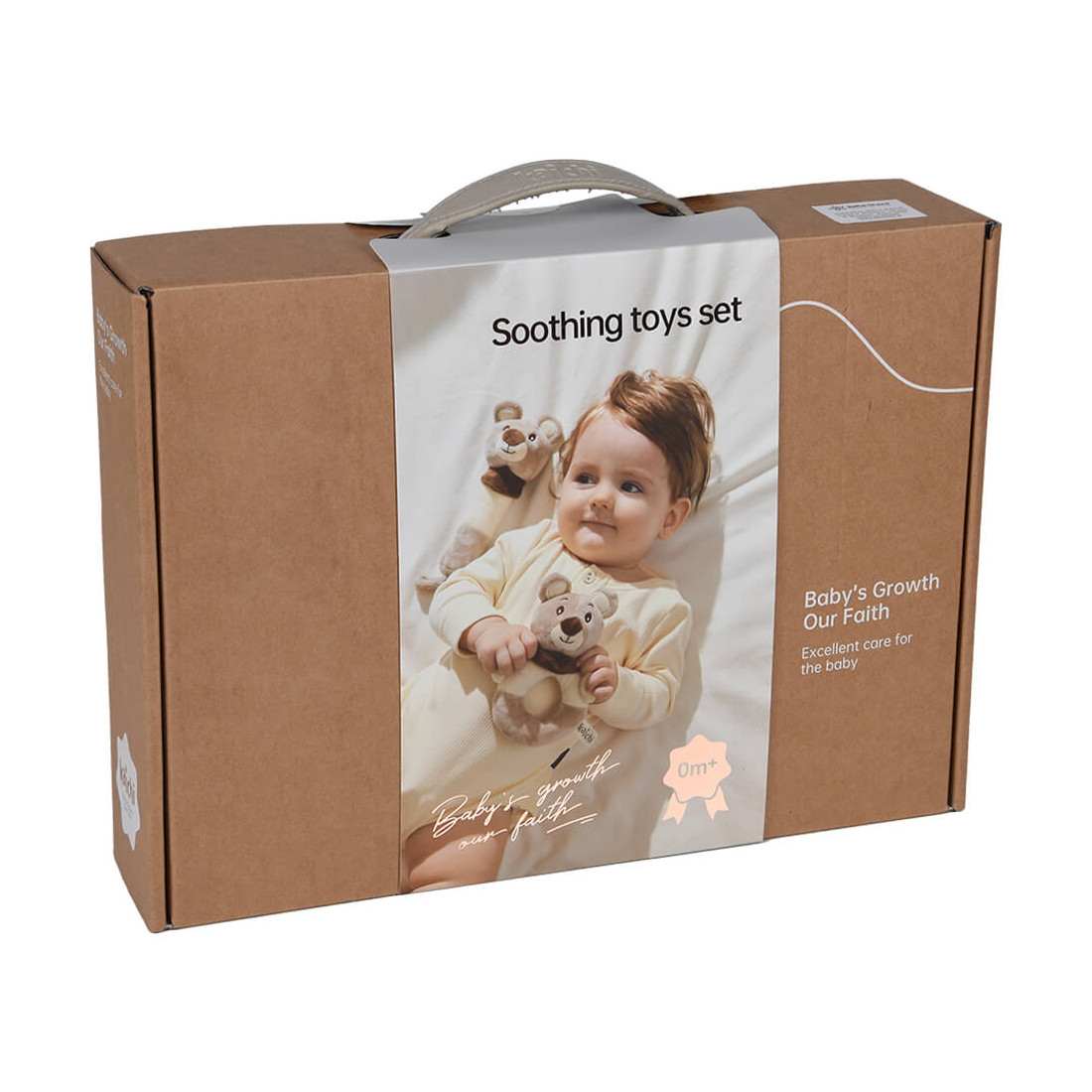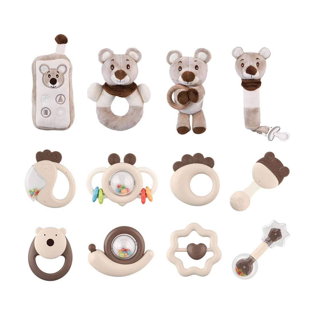 Το σετ περιλαμβάνει διάφορες κουδουνίστρες (μαλακές και μη) και μασητικά σε πολλά σχήματα και σχέδια από ζωάκια, ώστε να είναι δελεαστικά στα παιδιά και να απασχολούνται συνέχεια όσο ανακουφίζονται από οδοντικούς πόνους, καθώς και μια κουδουνίστρα με δυνατότητα να κρεμάσετε τη πιπίλα του μωρού σας.