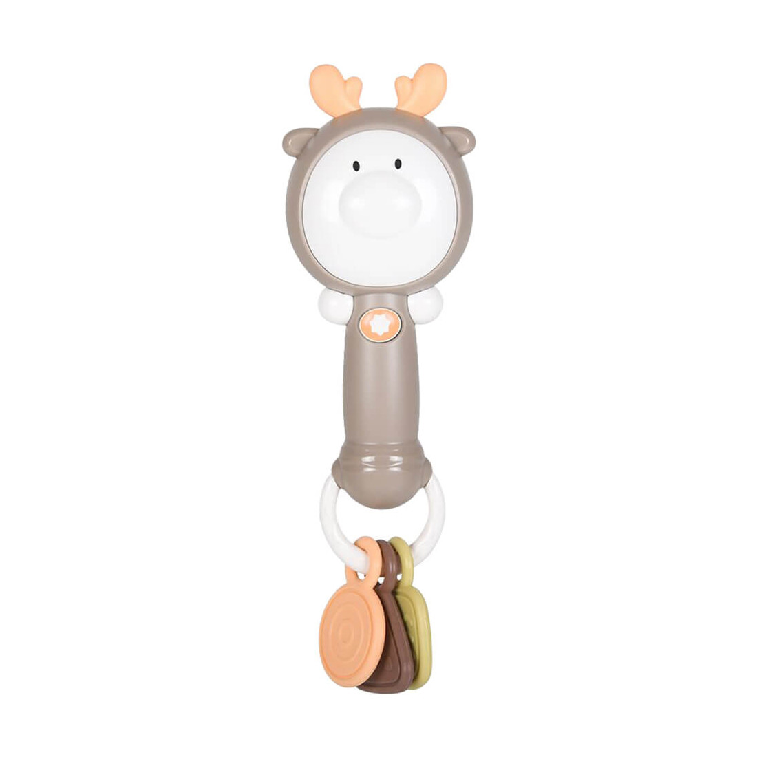 – Μια κουδουνίστρα αποτελεί το απόλυτο παιχνίδι διασκέδασης και απασχόλησης για ώρα ενός μωρού. Έτσι και αυτή η κουδουνίστρα με τα κρεμαστά μασητικά βοηθάει και εκπαιδεύει το παιδάκι σας στην ανάπτυξη οπτικών, κινητικών και ακουστικών δεξιοτήτων του. Μαθαίνει να ξεχωρίζει σχήματα και χρώματα και ακόμη, μαθαίνει να συντονίζει ότι με κάθε κίνηση παράγεται και ένας ήχος, καθώς διαθέτει μουσική και φωτάκια. Η κουδουνίστρα τροφοδοτείται από μπαταρίες 1×1,5V «AAA» (Δεν περιλαμβάνονται). Διαθέτει διακόπτη On/off. Κατασκευασμένο από ασφαλές πλαστικό υλικό, χωρίς BPA. Ευρωπαϊκές προδιαγραφές ΕΝ71, CE.