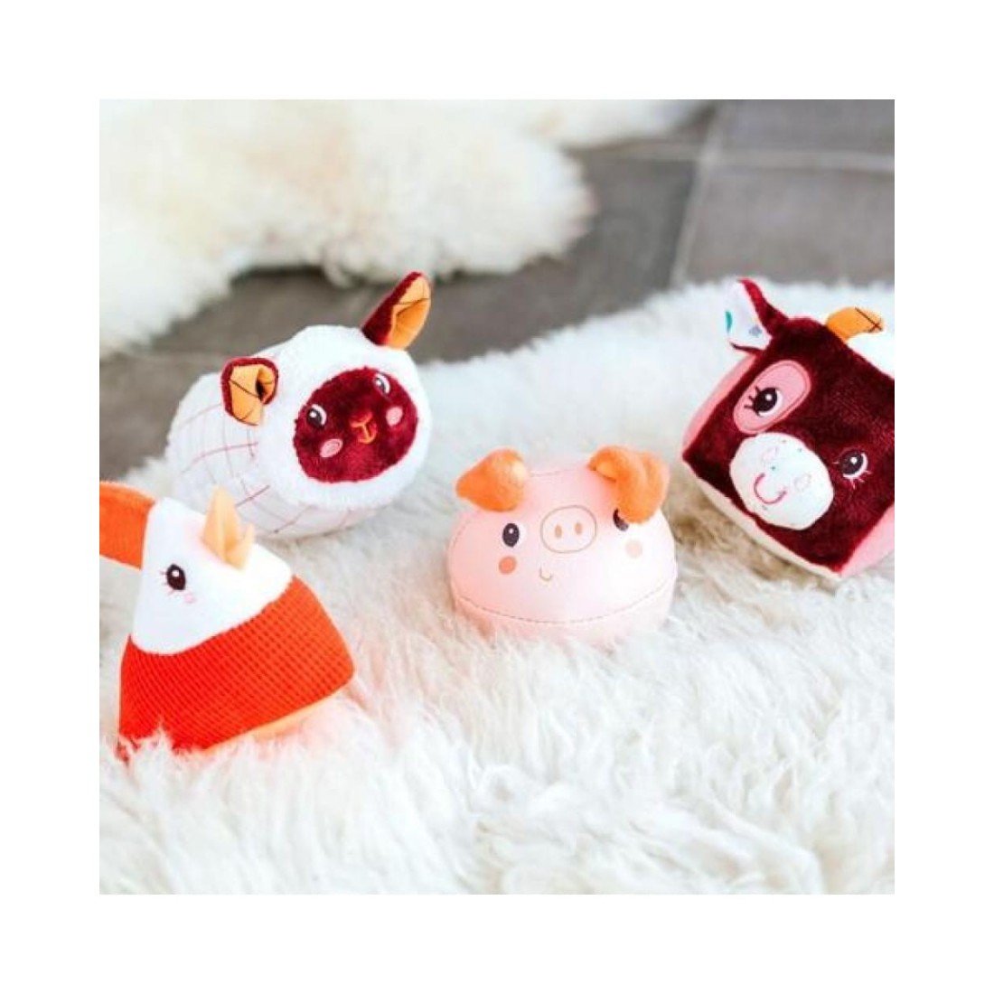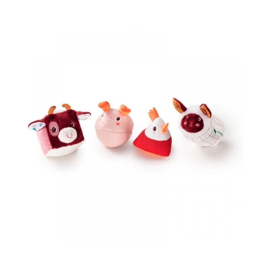 Υποδεχθείτε μία απαλή, πολύχρωμη συμμορία ζώων της φάρμας, αποτελούμενη από 4 κουδουνίστρες.