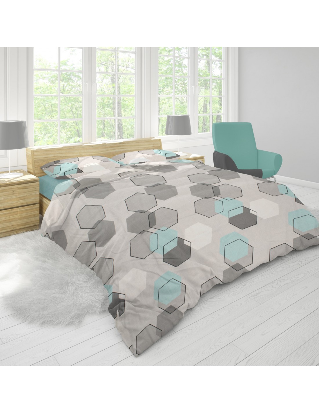 Κατασκευασμένη στην πάνω πλευρά από ύφασμα Εμπριμέ σύνθεσης 70% βαμβάκι - 30% Polyester, 144 κλωστών, σε χαρούμενα και απαλά χρώματα, με μοντέρνες και σύγχρονες παραστάσεις και στη κάτω πλευρά από μονόχρωμο petrol μελανζέ κομποζέ ύφασμα της ίδιας σύνθεσης για προστασία στο πάπλωμα σας και χρώματα στο κρεβάτι σας.