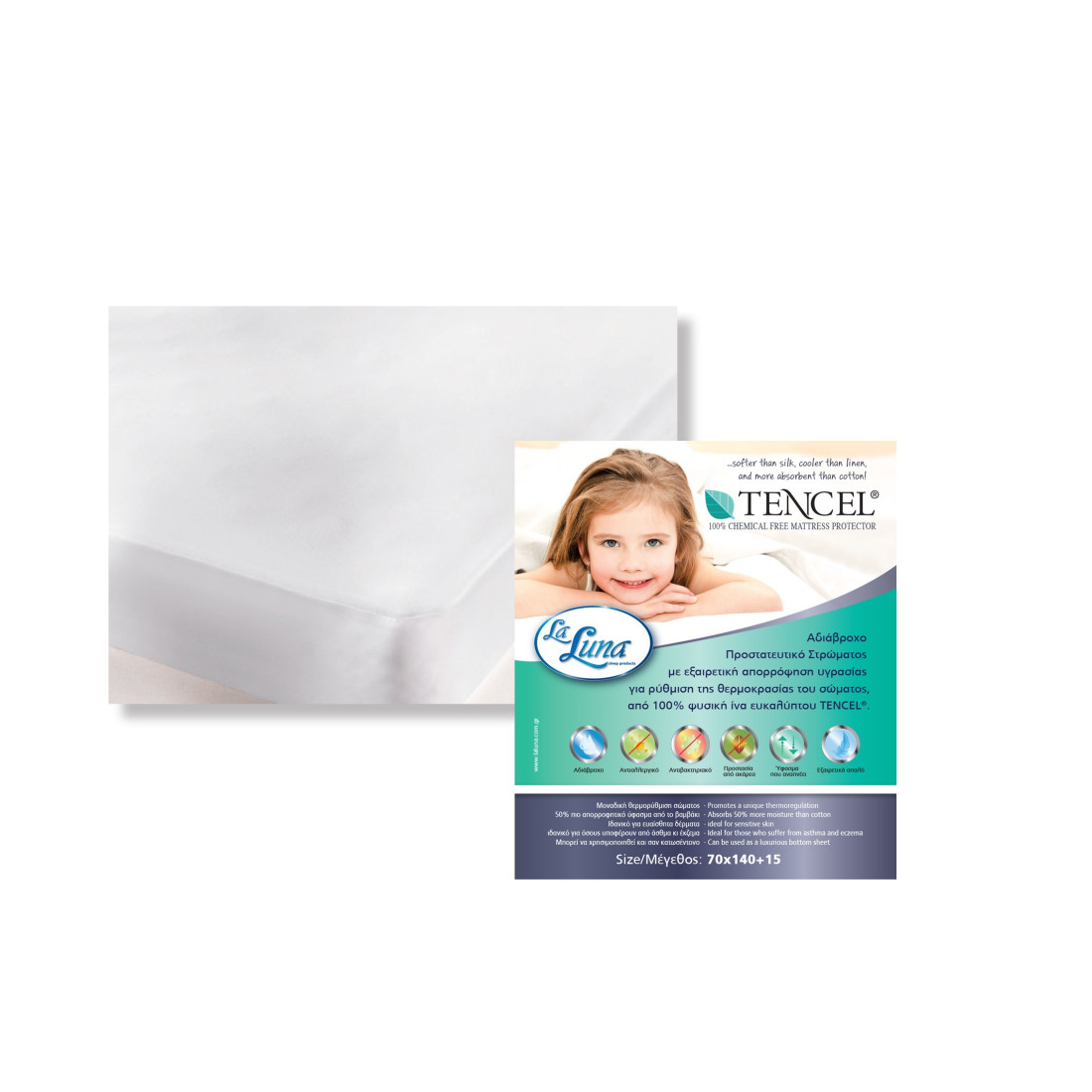 Αδιάβροχο προστατευτικό κάλυμμα στρώματος με επιφάνεια από φυσικές αντιβακτηριαδιακές ίνες ευκαλύπτου και φυσική ίνα Tencel για τη διατήρηση της ιδανικήςθερμοκρασίας στον ύπνο. Βάση από ειδική, πλήρως αδιάβροχη μεμβράνη PU με πόρους που επιτρέπουν τα μόρια του αέρα να την διαπερνούν. Υποαλλεργικό