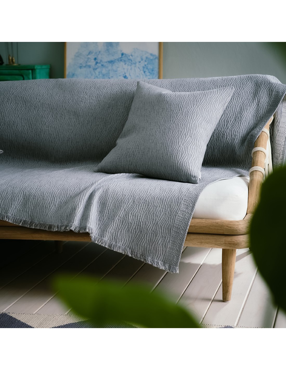Ριχτάρι από δροσερό, βαμβακερό ύφασμα με ανάγλυφο υφαντό σχέδιο. Η πυκνή του ύφανση κάνει το ύφασμα πολύ ανθεκτικό. Κατασκευασμένο από πενιέ βαμβακερά νήματα που αποτρέπουν την δημιουργία κόμπων pilling. Διακριτικό κρόσι 2cm στις δύο πλευρές.