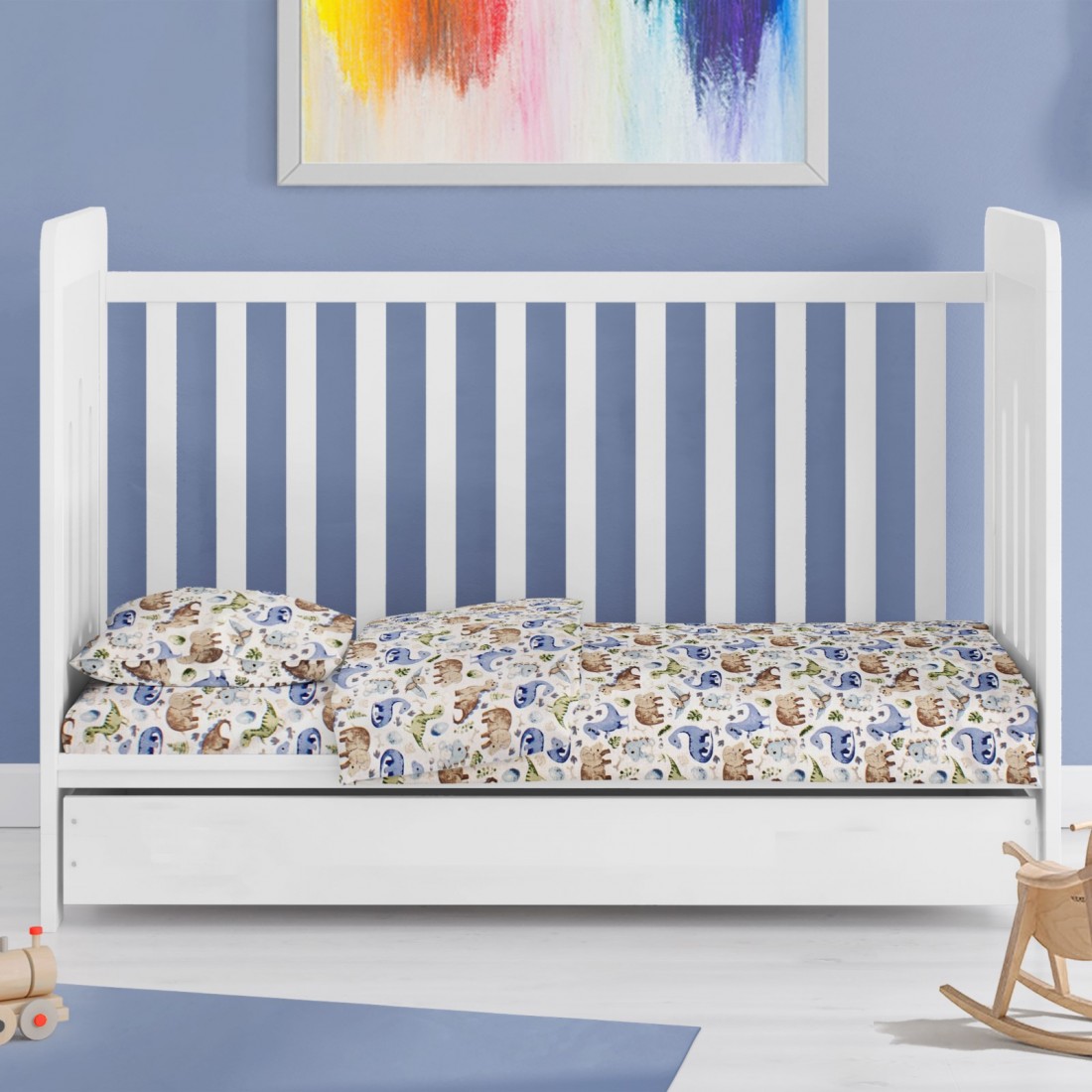 Κατασκευασμένο από απαλό ύφασμα 100% βαμβακερό, 144 κλωστών, σε χαρούμενα χρώματα με μοντέρνες βρεφικές παραστάσεις για τη κούνια του μωρού σας.